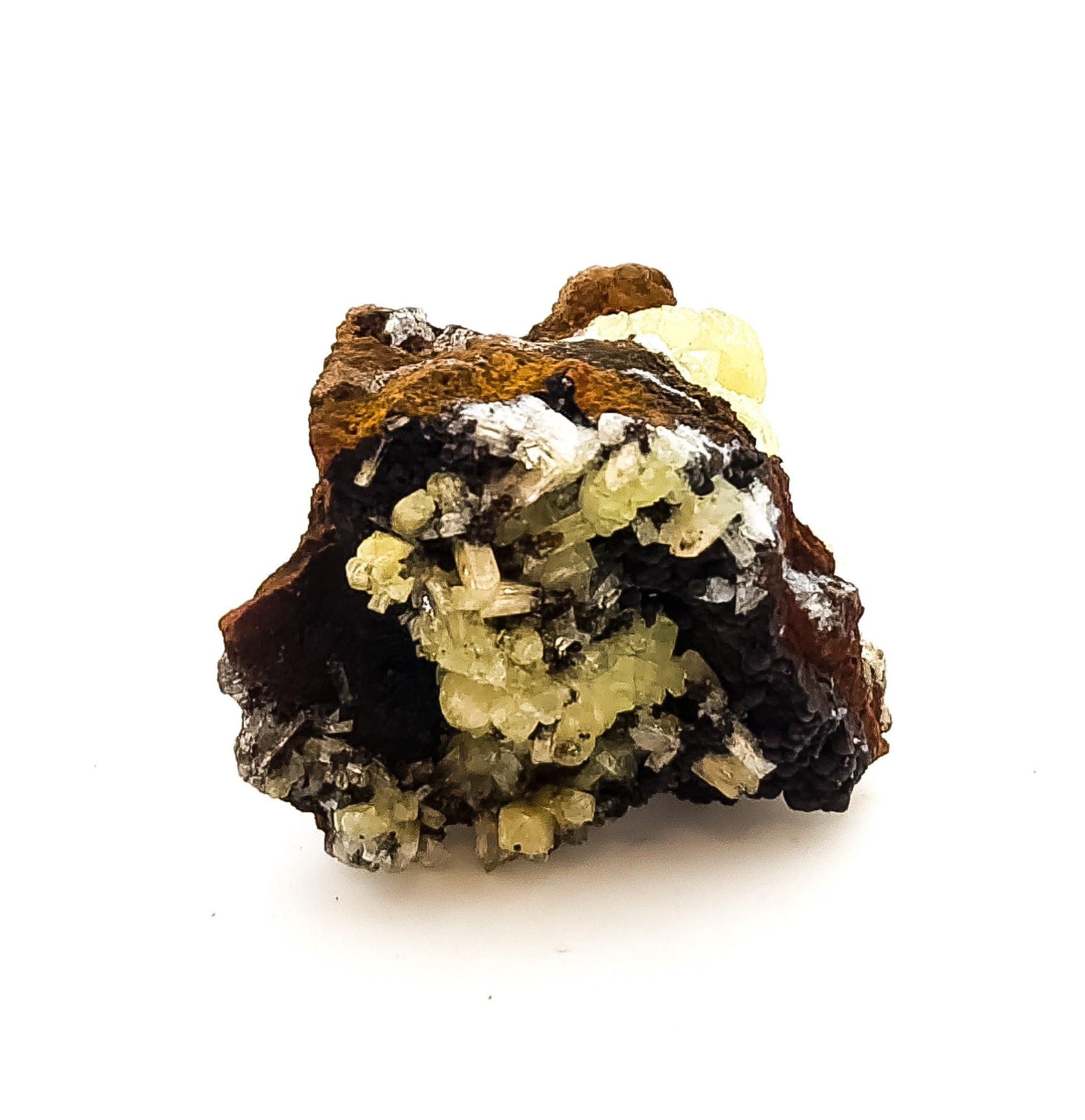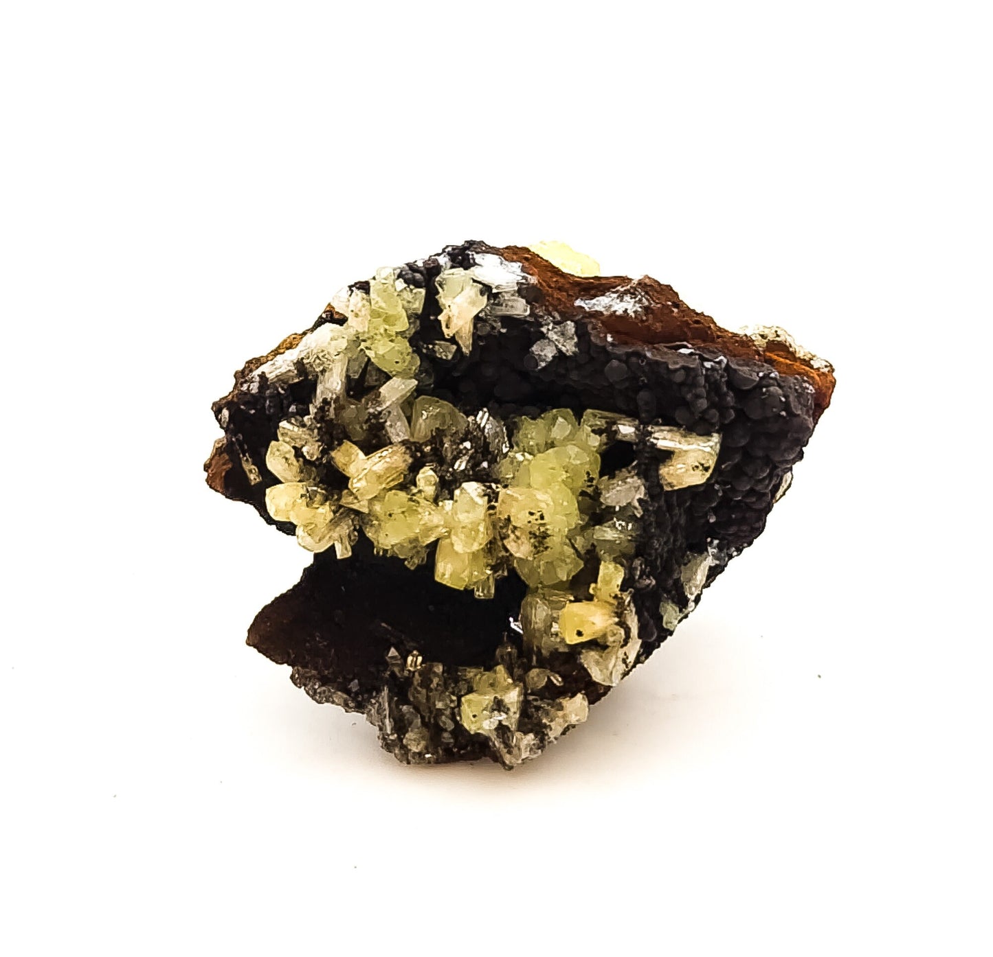 Offered here is a gorgeous specimen of the most saturate and intense yellow-green adamite! The crystals are super lustrous and both radiating and tabular crystal habits are present on a gossan with botryoidal goethite matrix. A lovely contrast of colors!