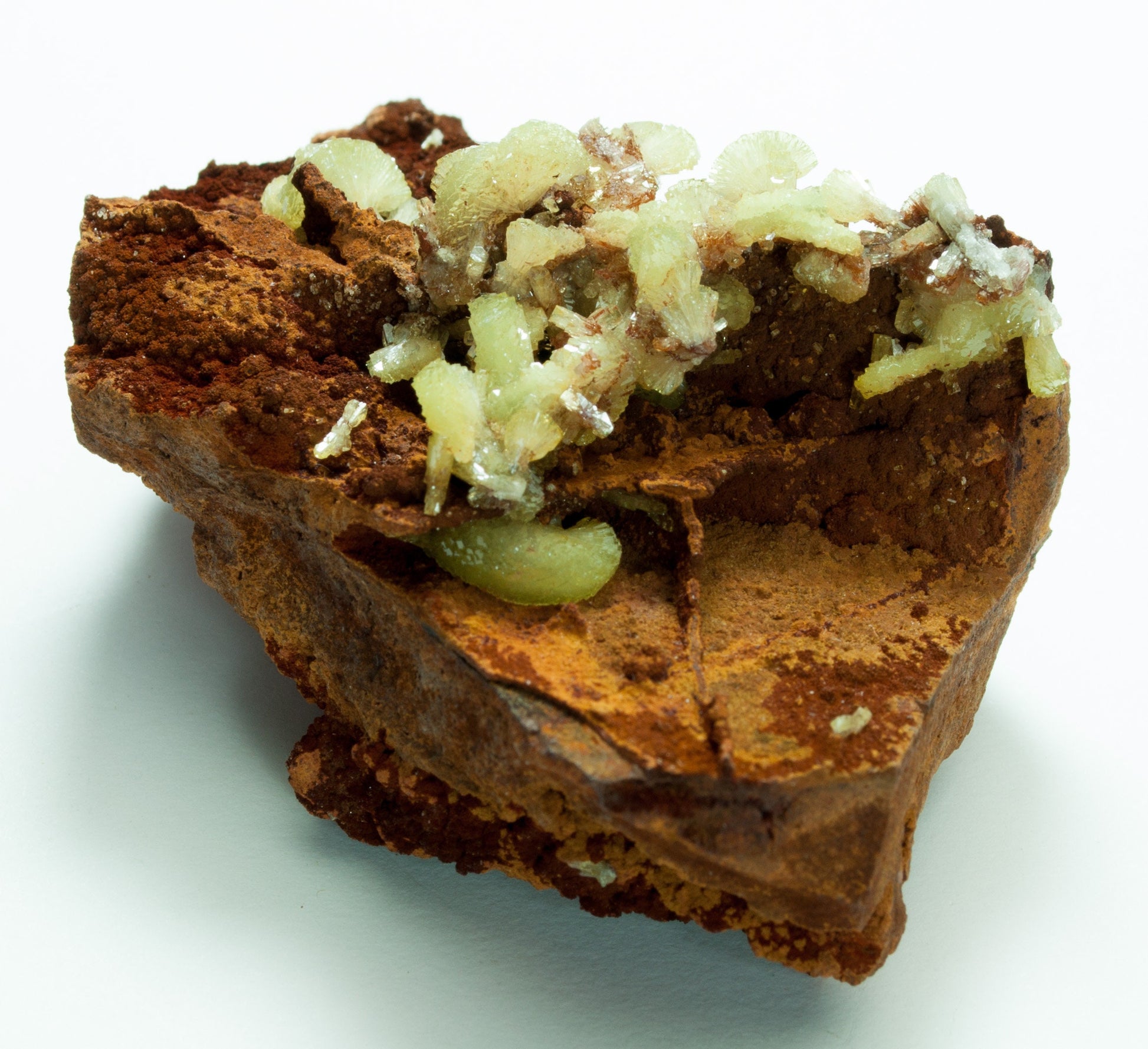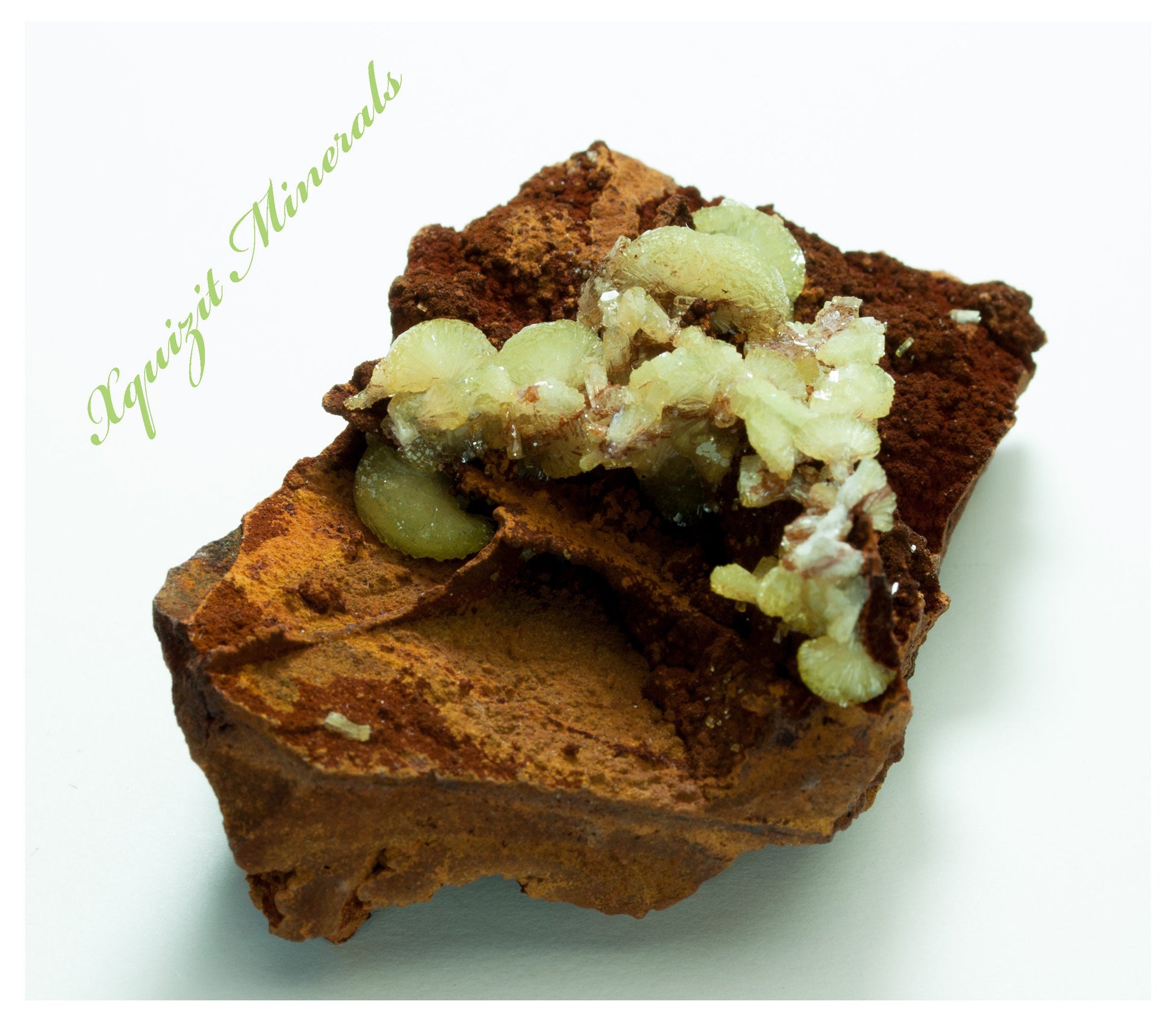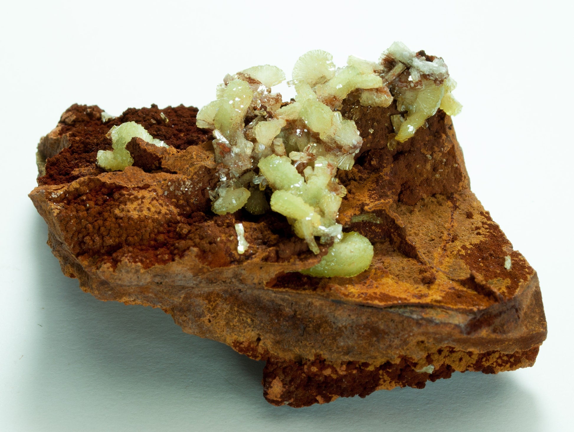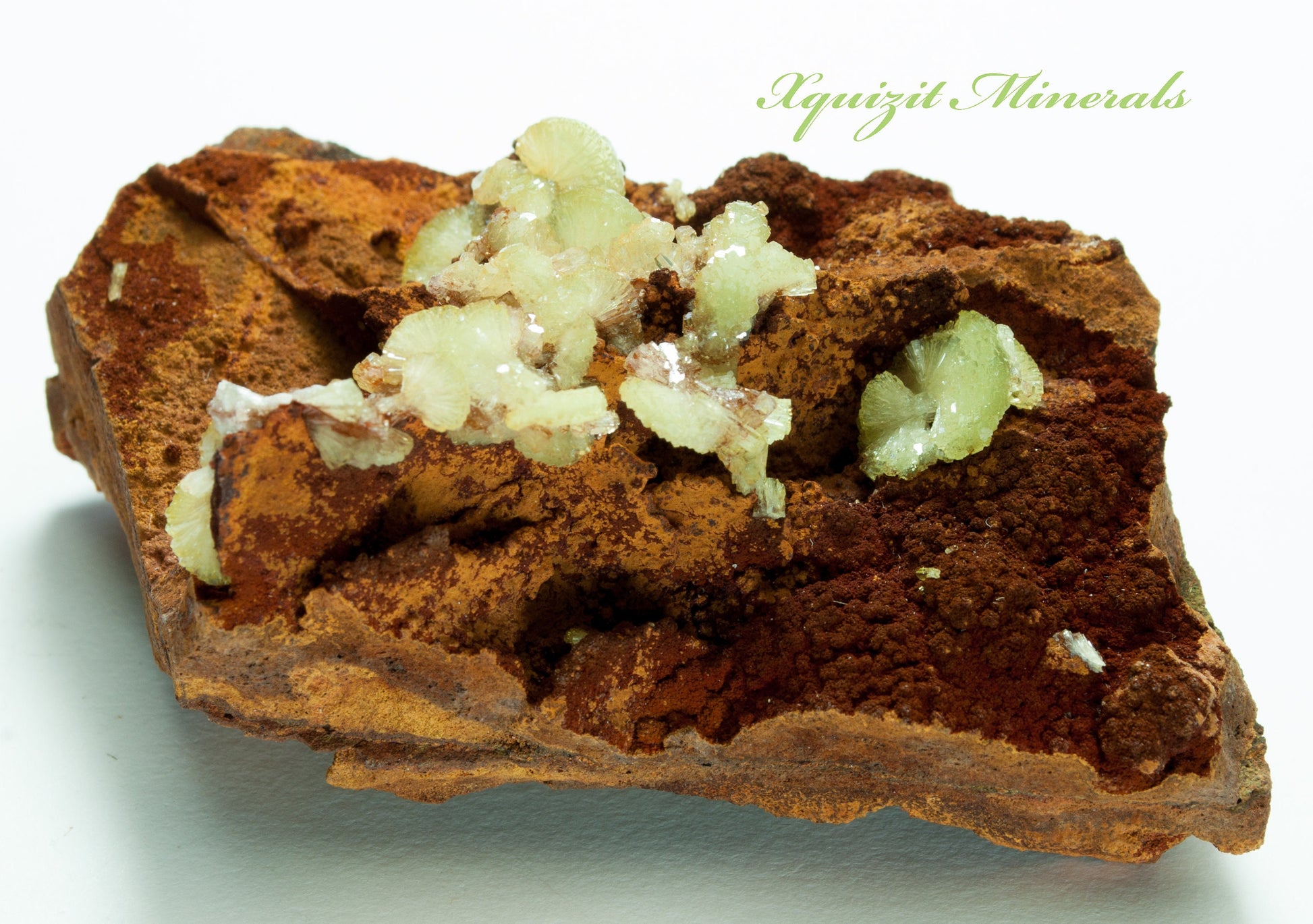 This is a gorgeous specimen of highly lustrous, radial aggregates of bright yellow-green adamite on a contrasting red gossan matrix!