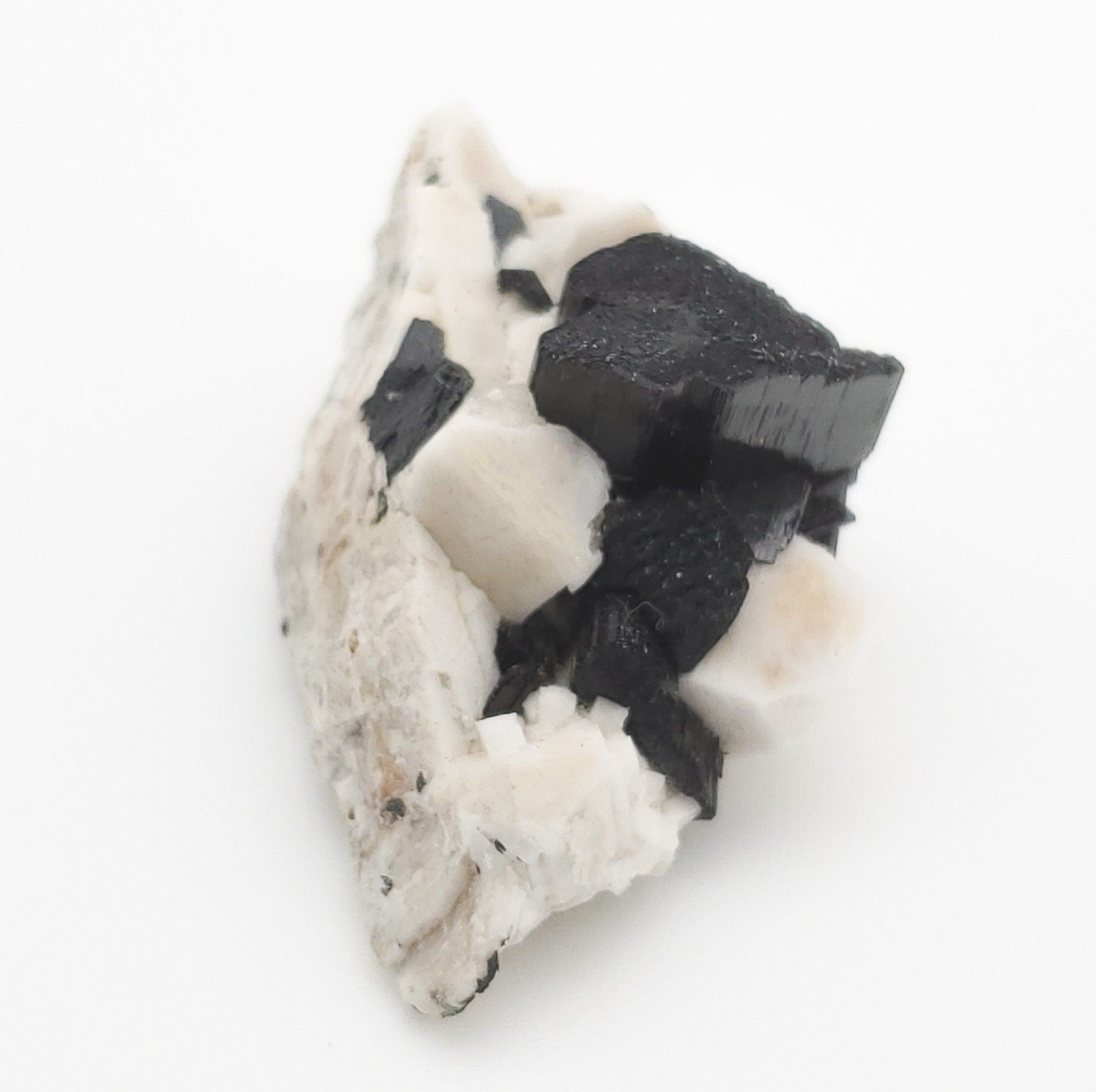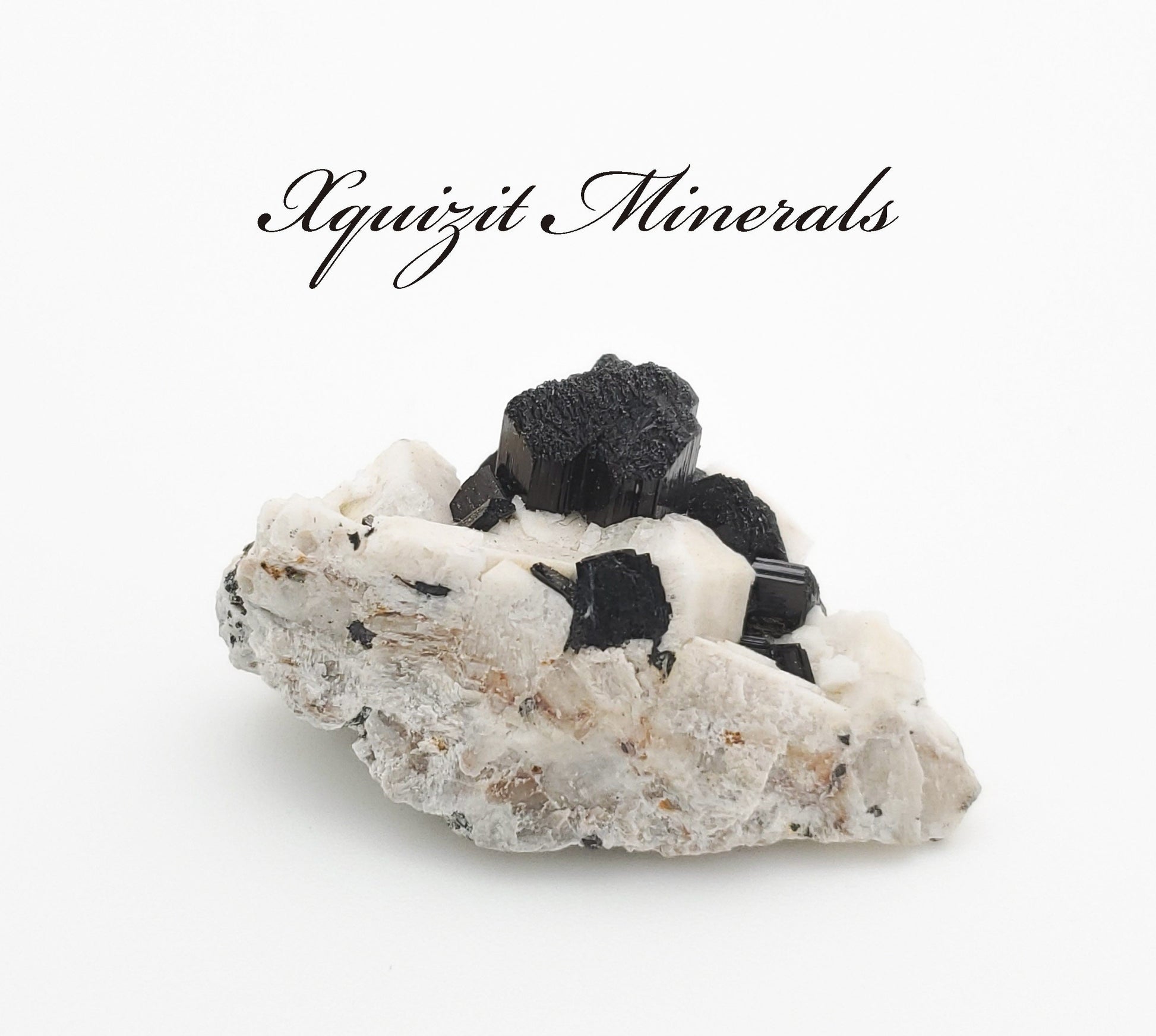 Offered here is a miniature size specimen of black aegirine on creamy feldspar matrix!