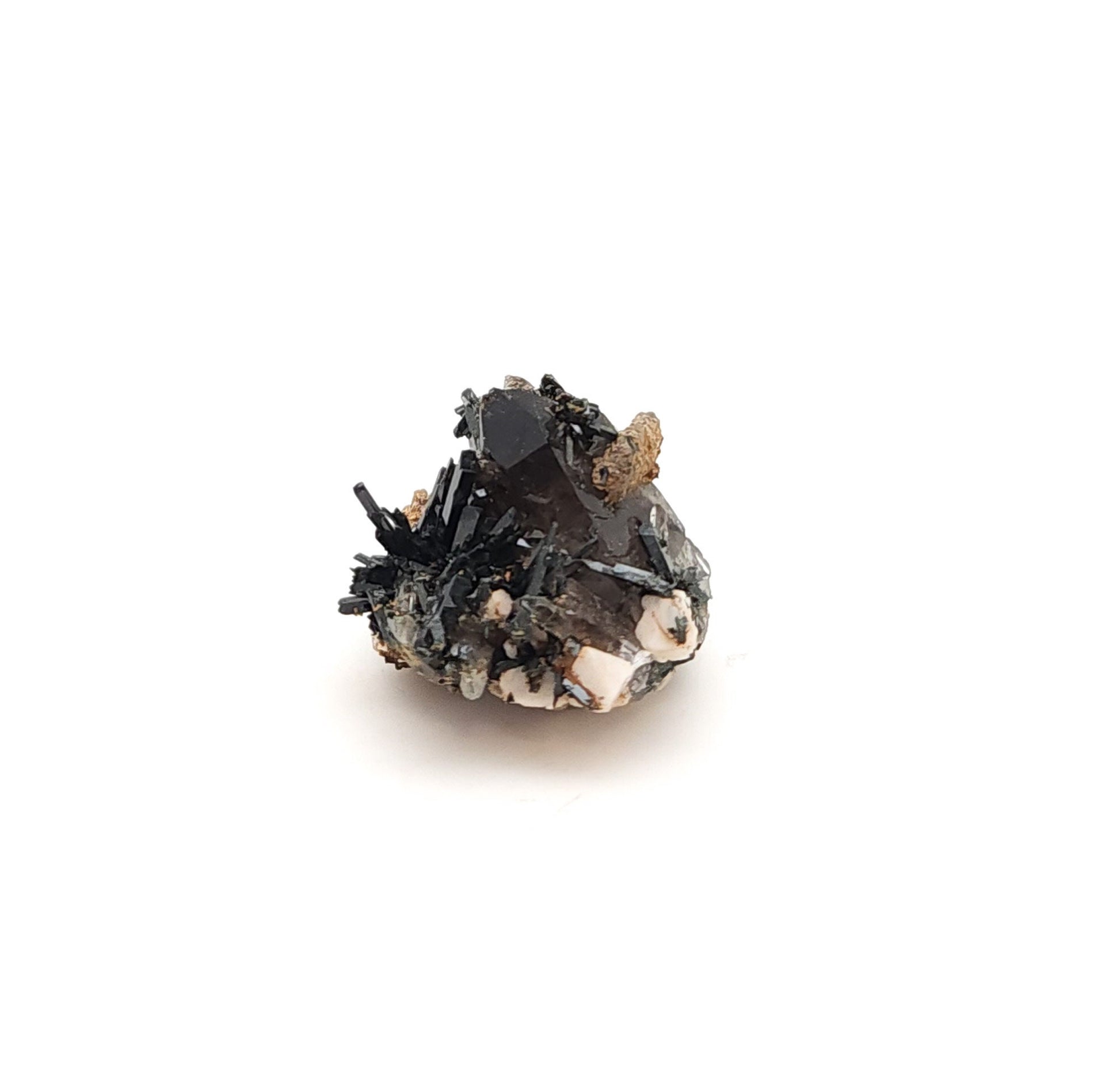 Offered here is a nice specimen with aegirine crystals to 1.9 cm, smoky quartz crystals to 2.9 cm and intermixed microcline crystals!