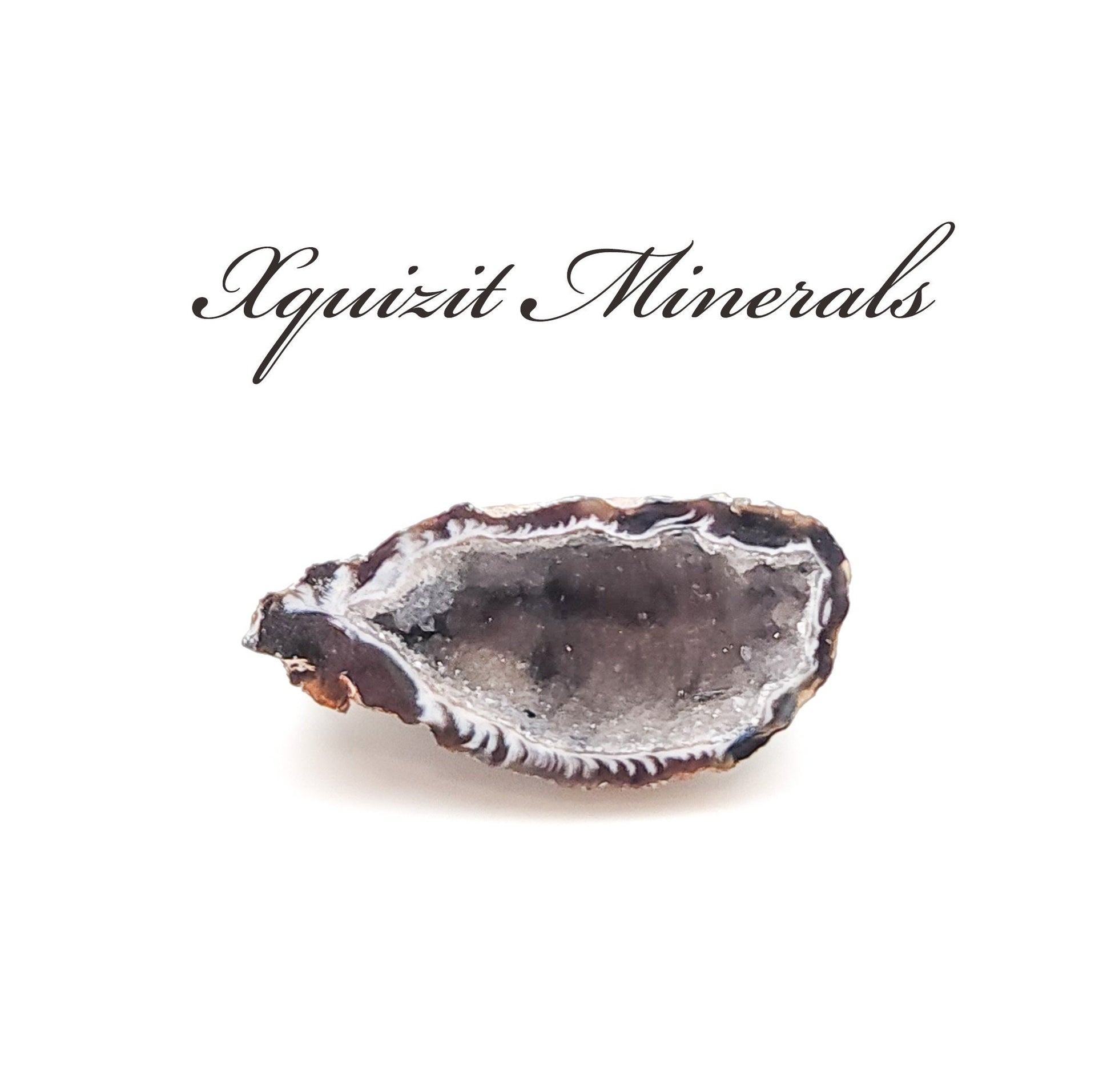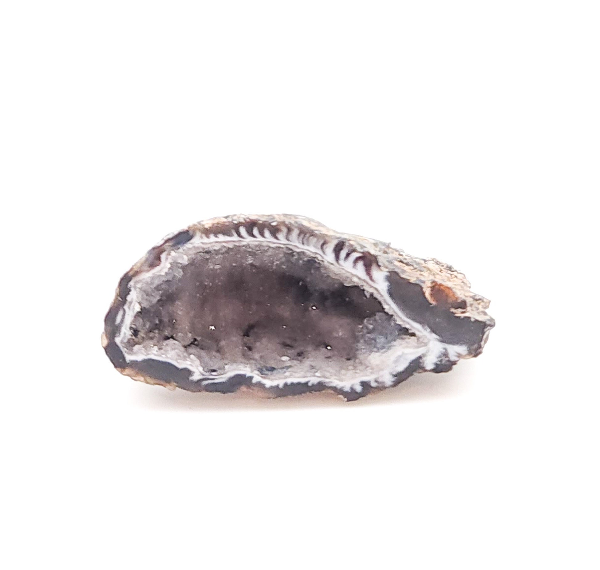 Offered here is a pretty agate geode with black dendritic inclusions in the sparkling quartz crystals inside the geode!