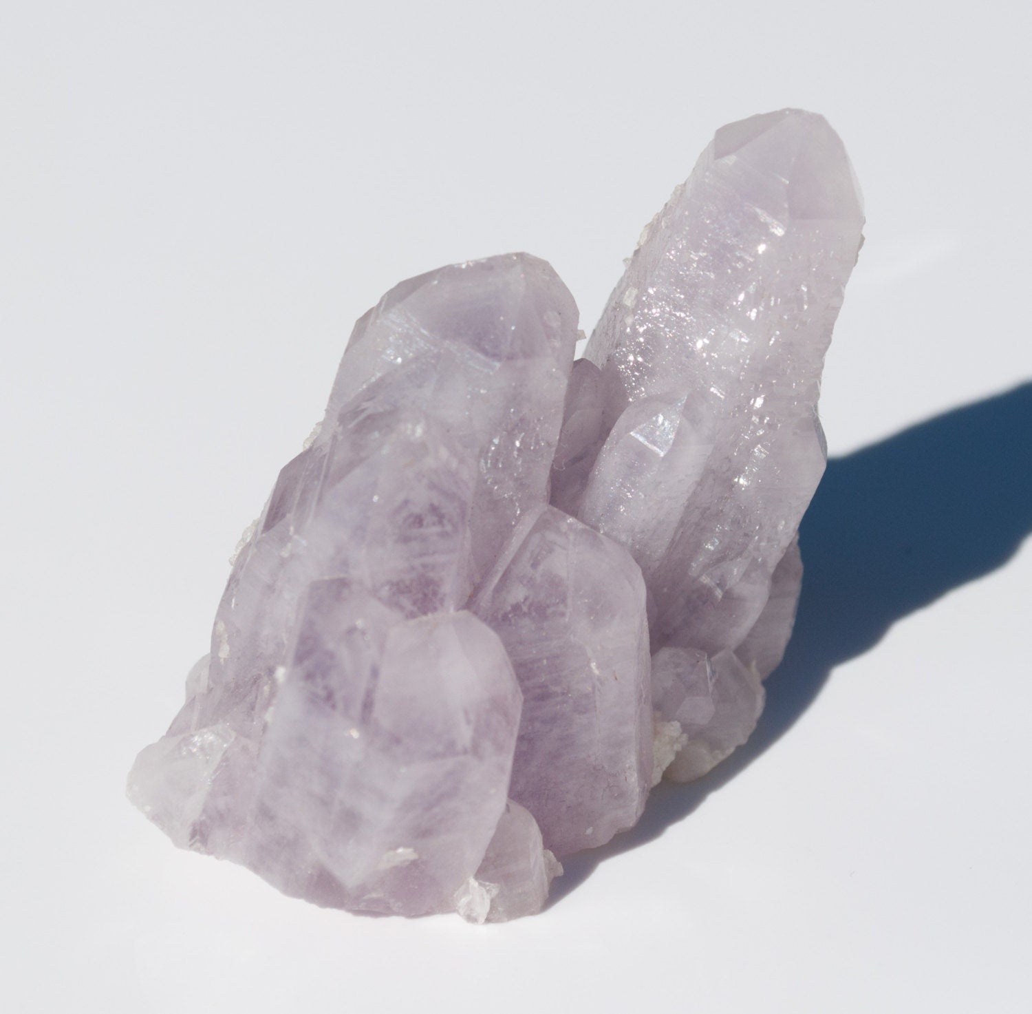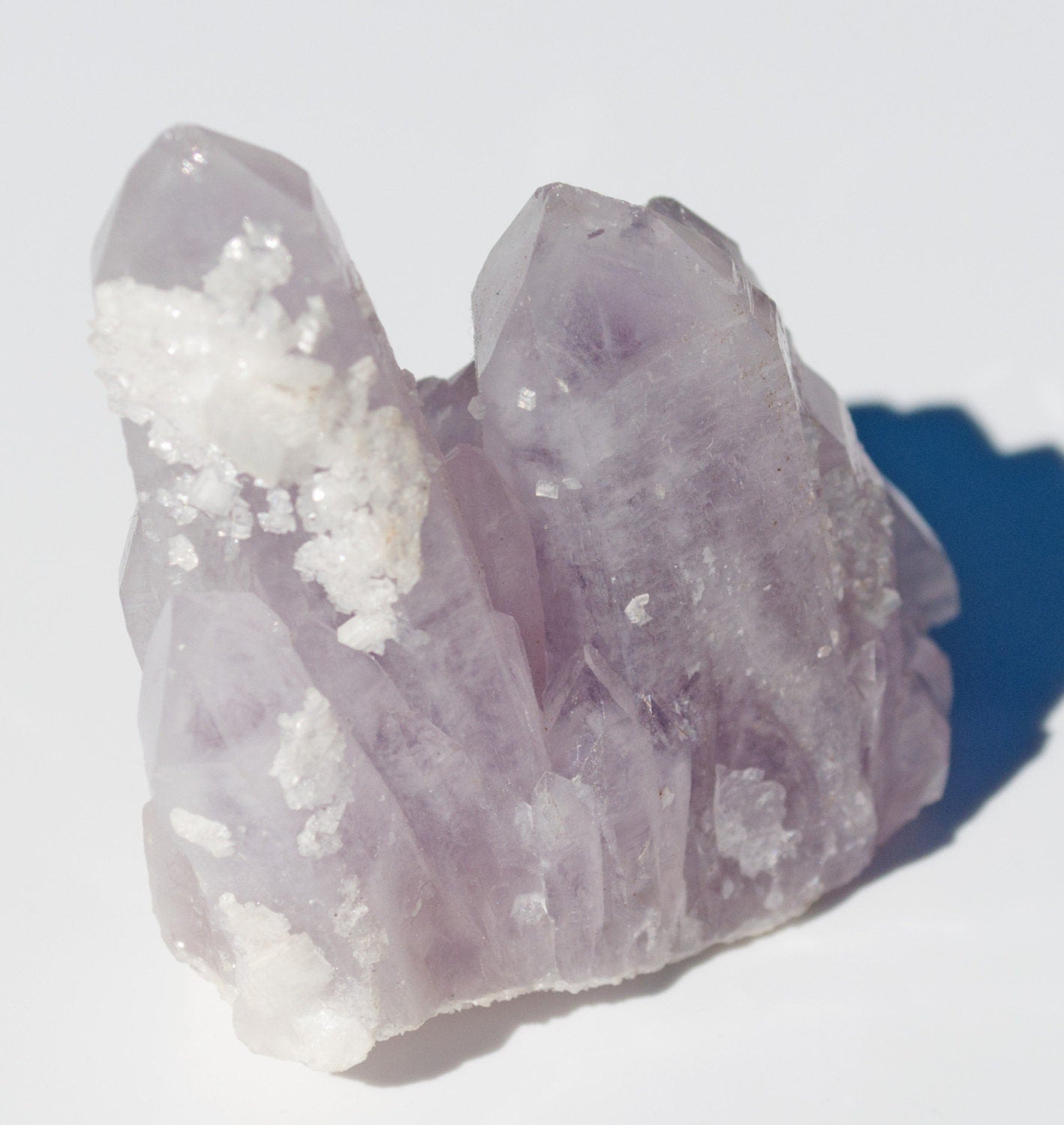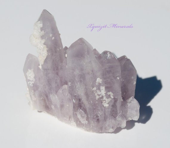 Beautiful cluster of light purple, amethyst crystals to 5.9 cm dotted with sugary white calcite crystals!