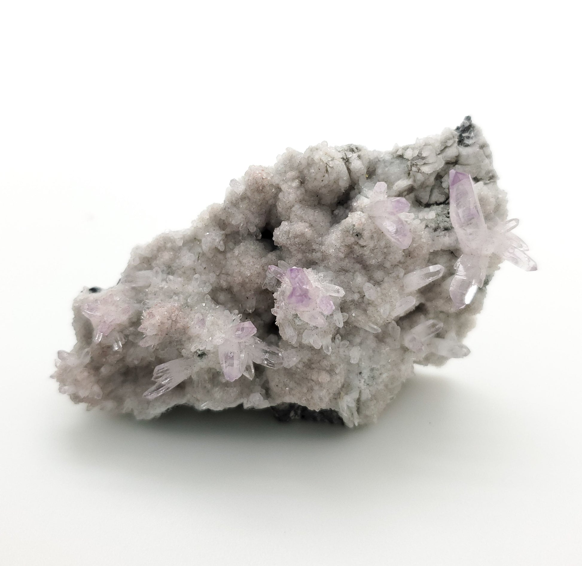 Offered here is a beautiful plate of amethyst crystals to 1.8 cm on matrix! Small cluster sprays of light purple amethyst atop light grey druze.