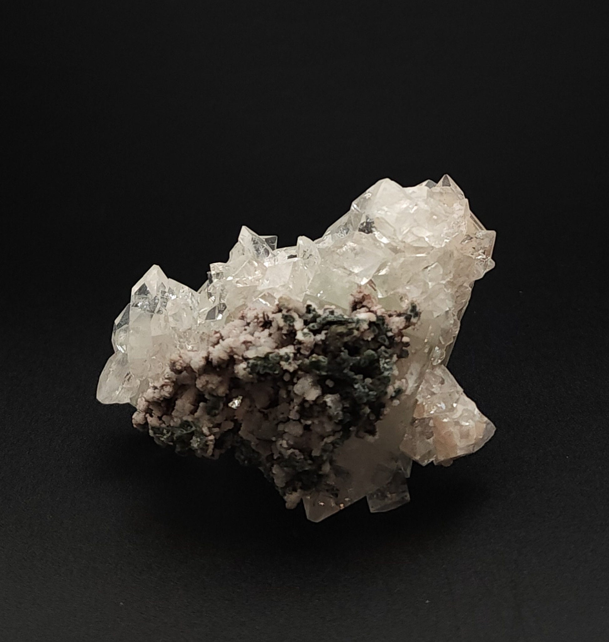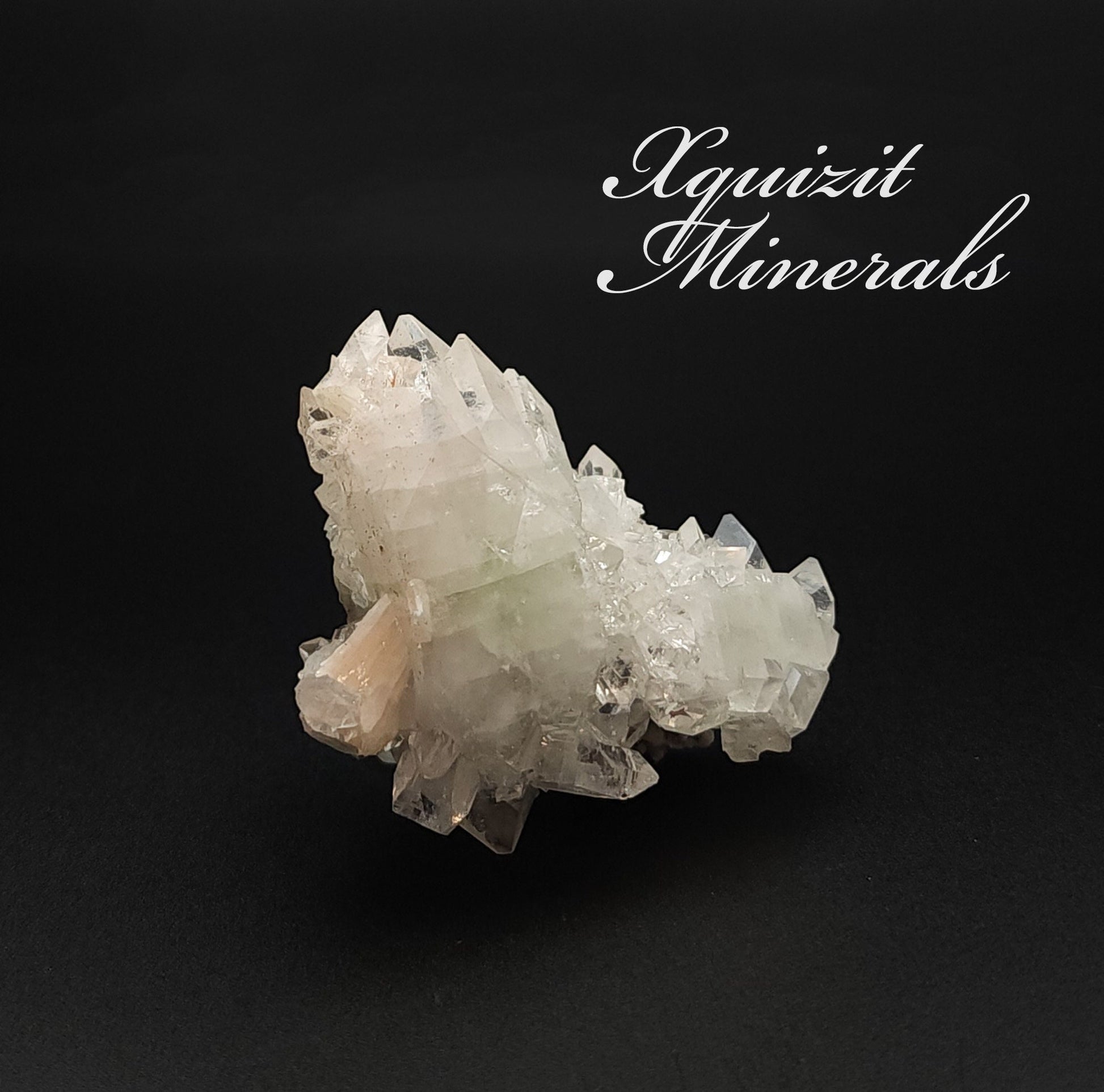 Offered here is a cluster of lustrous, double terminated apophyllite crystals to 4.6 cm x 2.2 cm and light peach colored stilbite perched atop a bit of soft lilac colored, druze covered matrix! Very aesthetic piece!