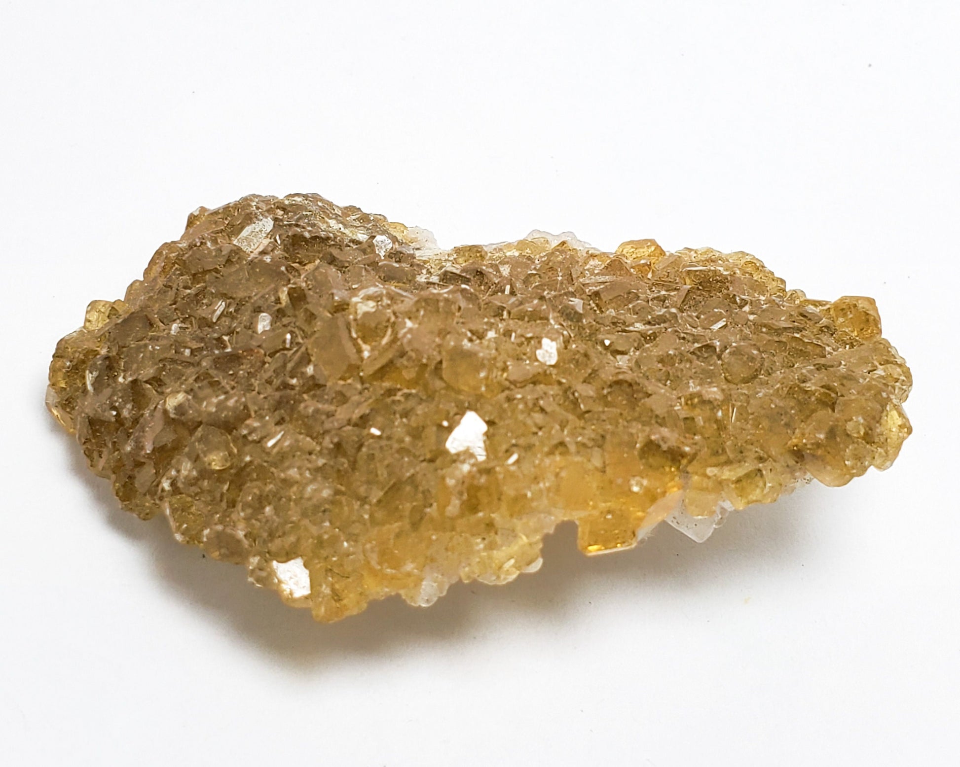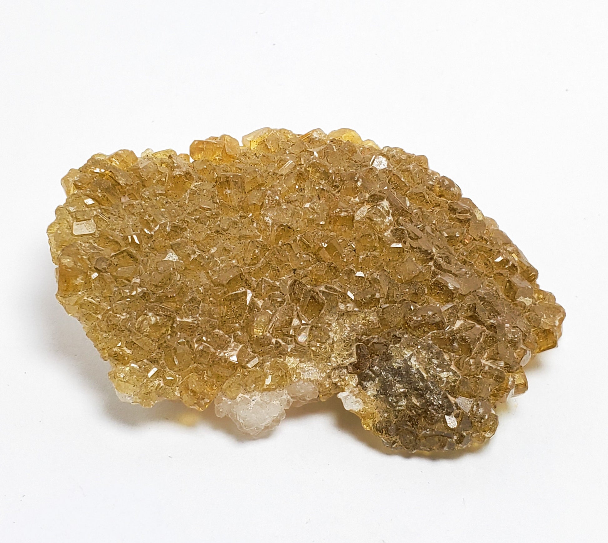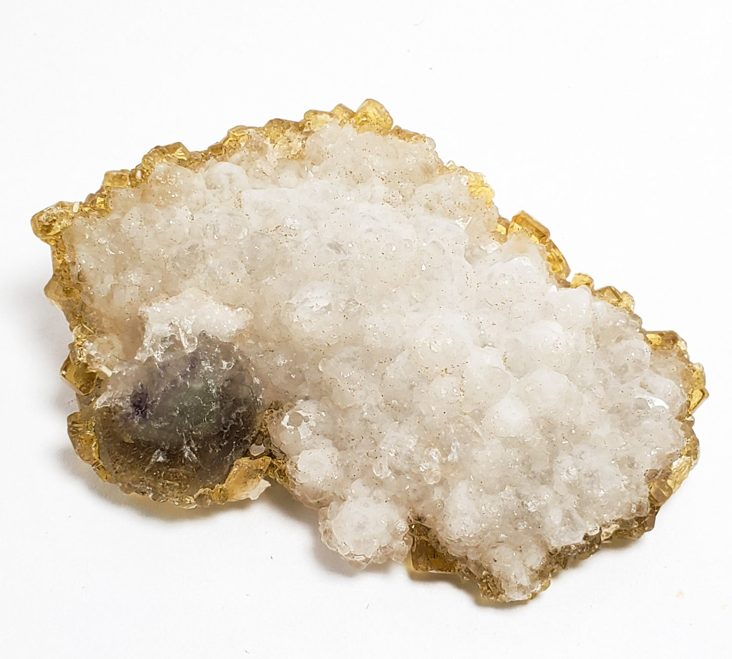 Offered here is a beautiful miniature specimen of golden barite crystals on bright white druse quartz crystals with minor fluorite!