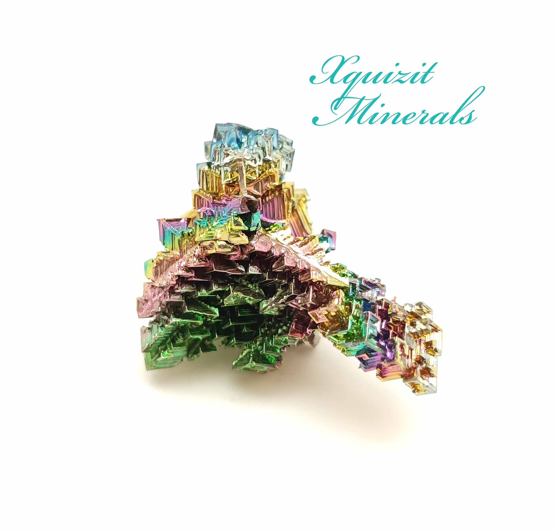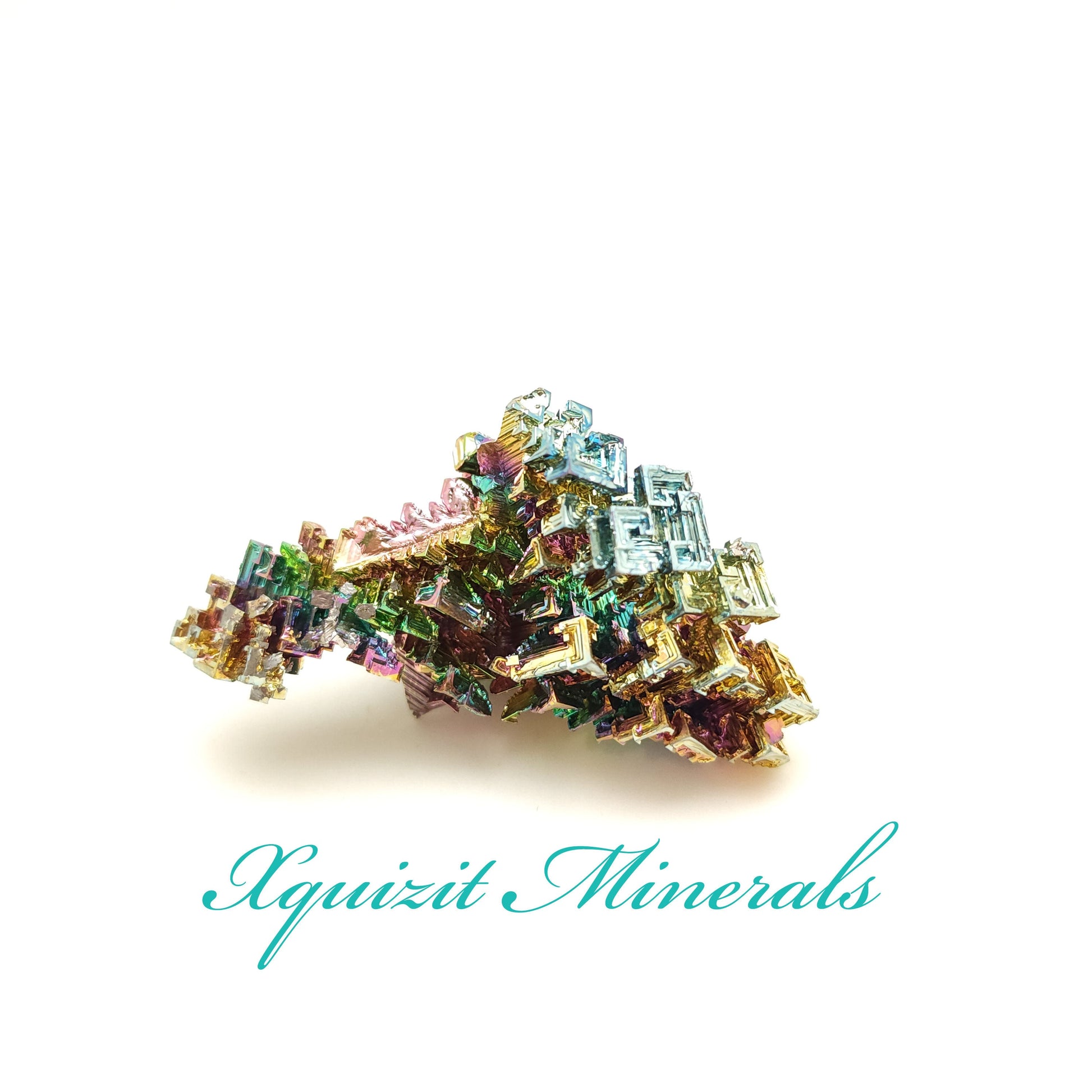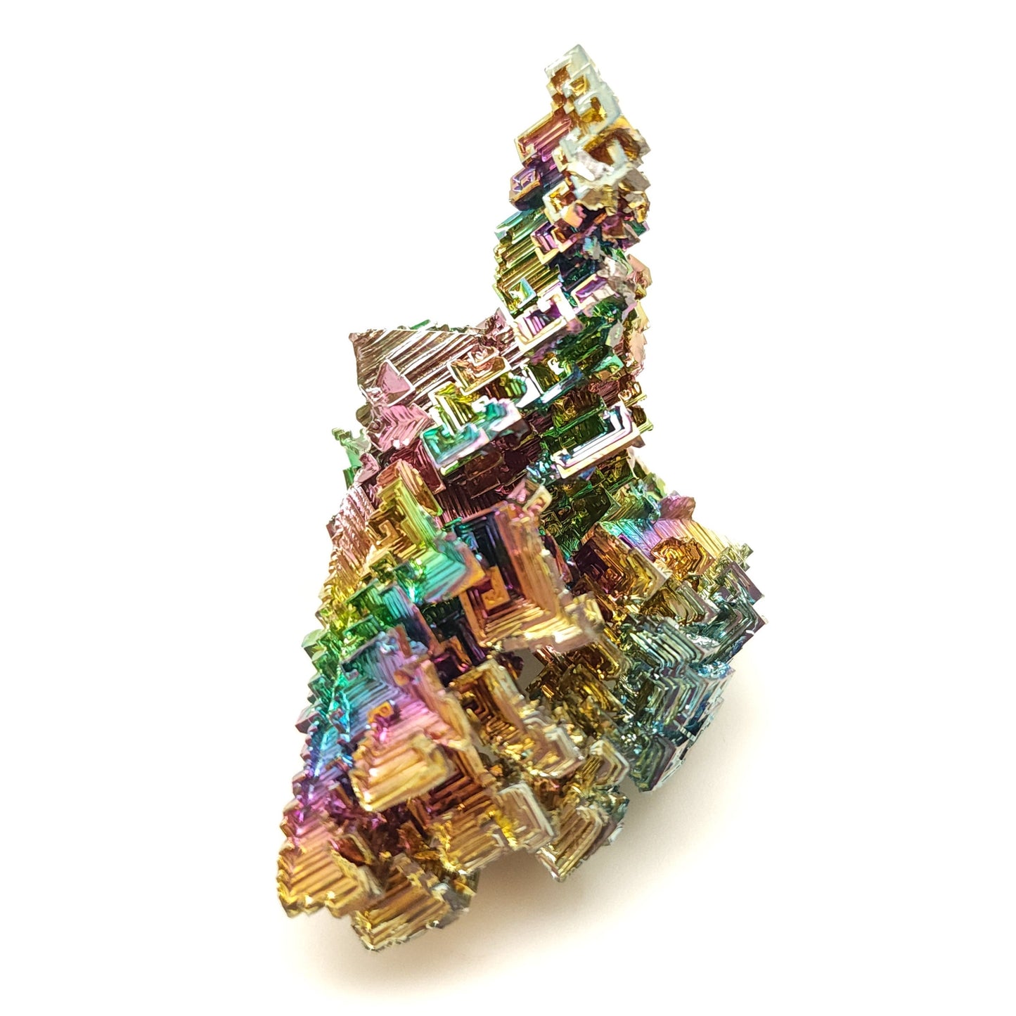 These crystals are usually made, or "grown" from commercial 99.99% pure bismuth pellets. High purity bismuth can form into distinctive and beautiful crystals. The crystals have a fairly rapid growth time and it is the rapid growth that causes hollow stepped forms which are called hopper crystals. The iridescent colors are due to a layer of bismuth oxide that forms on the surface of the crystals as they cool.