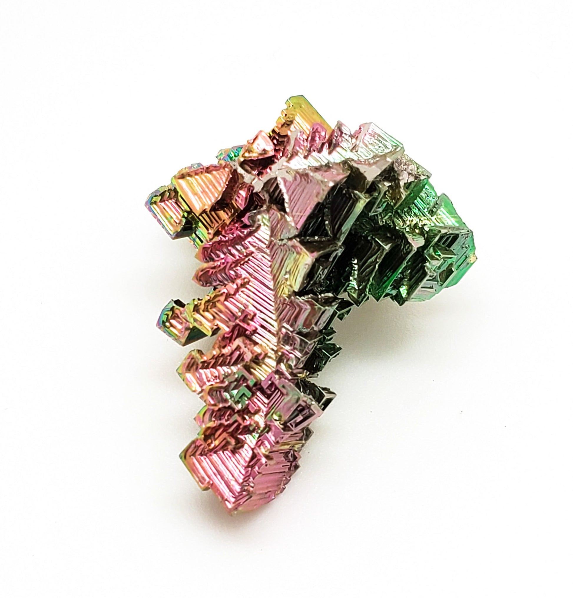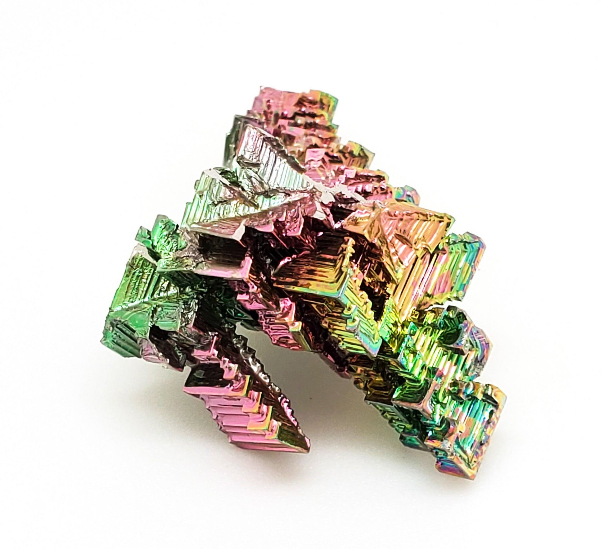 This is a beautiful, hoppered bismuth crystal with intense iridescent coloring and is very aesthetic at all angles! Bismuth are laboratory grown crystals. And though they are not natural, are still very beautiful specimens and sought after by many mineral collectors. These crystals are usually made, or "grown" from commercial 99.99% pure bismuth pellets. High purity bismuth can form into distinctive and beautiful crystals. The crystals have a fairly rapid growth time and it is the rapid growth that causes hollow stepped forms which are called hopper crystals. The iridescent colors are due to a layer of bismuth oxide that forms on the surface of the crystals as they cool.