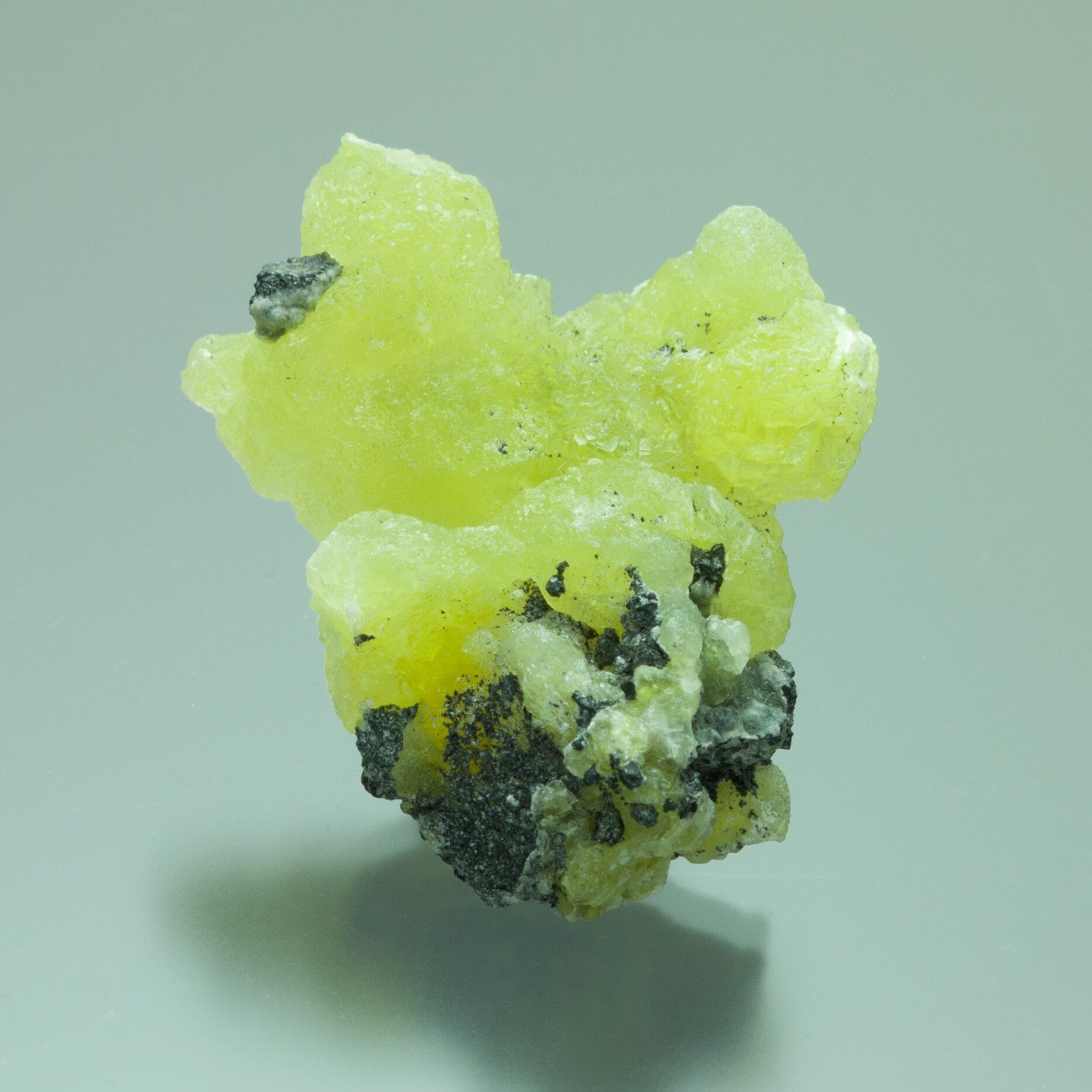 Offered here from a recent find is a beautiful bright yellow crystal of brucite with bits of matrix. This specimen is lemon yellow and very lustrous!