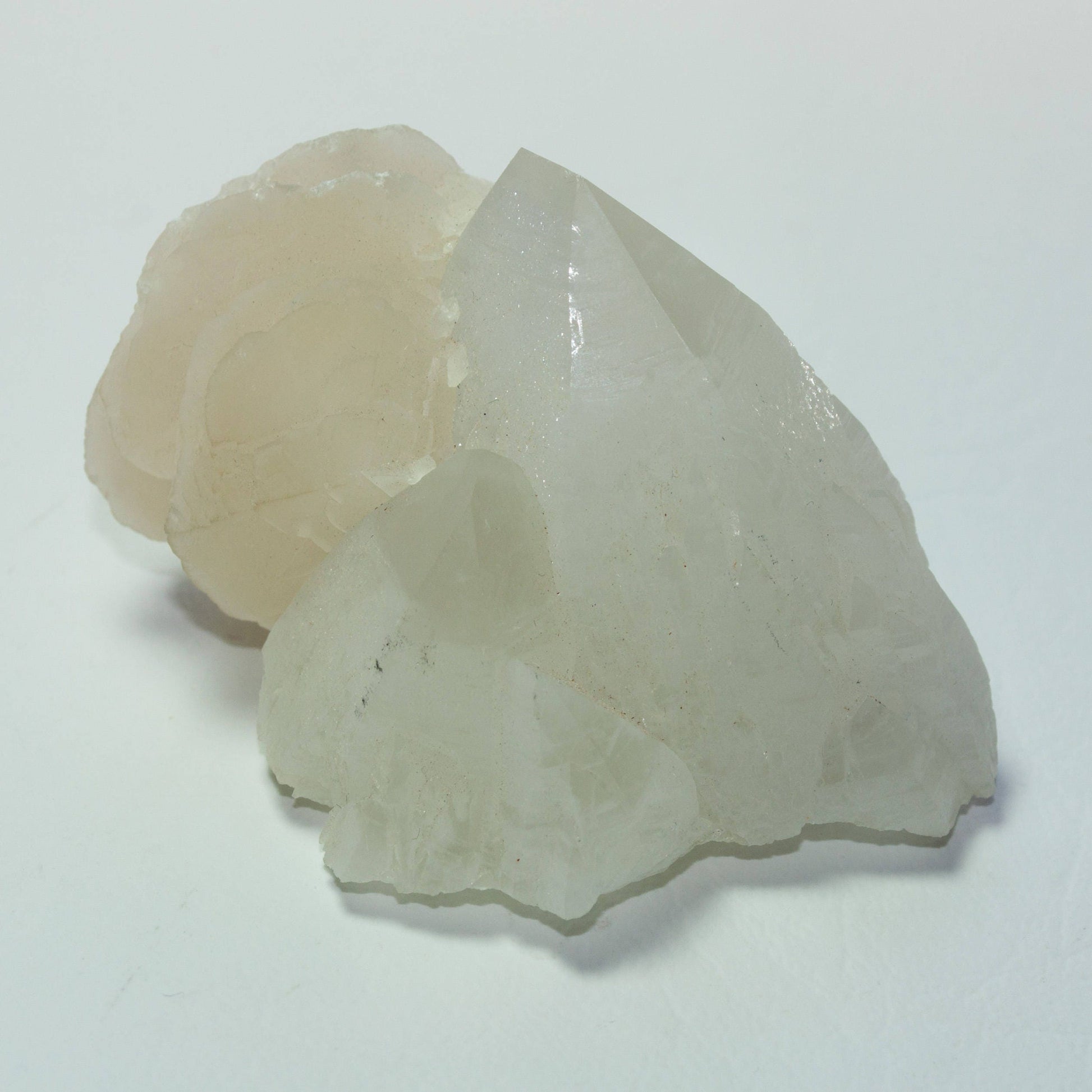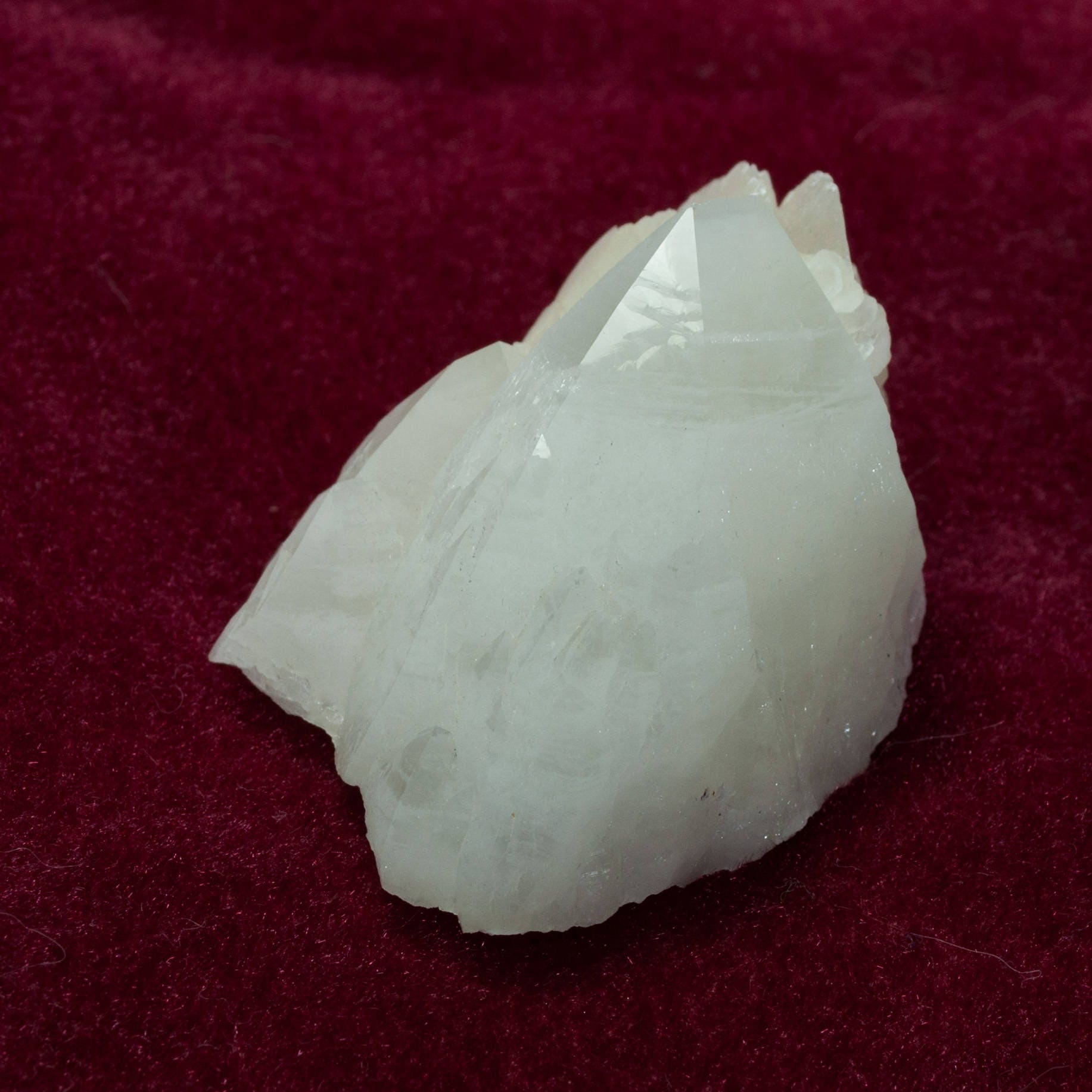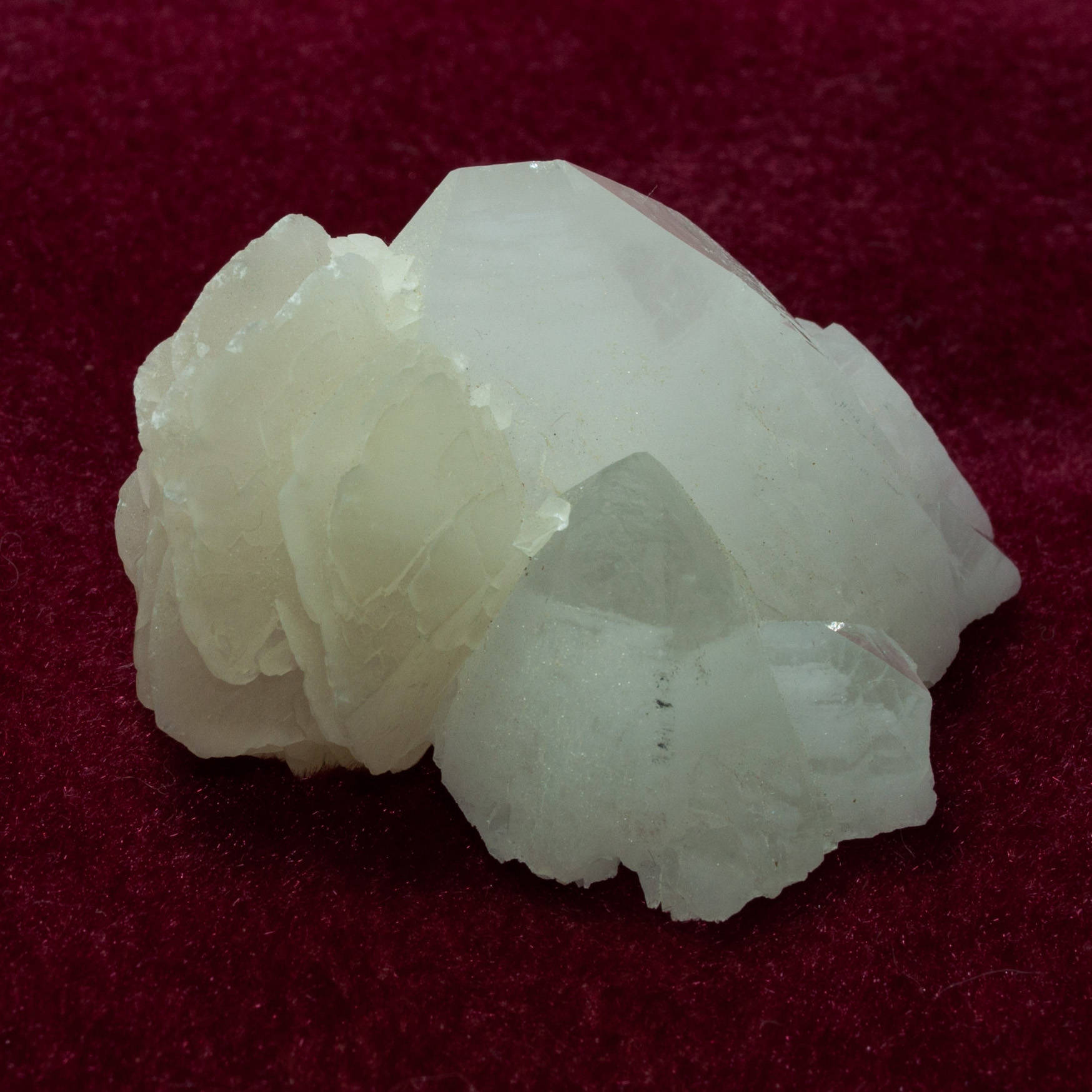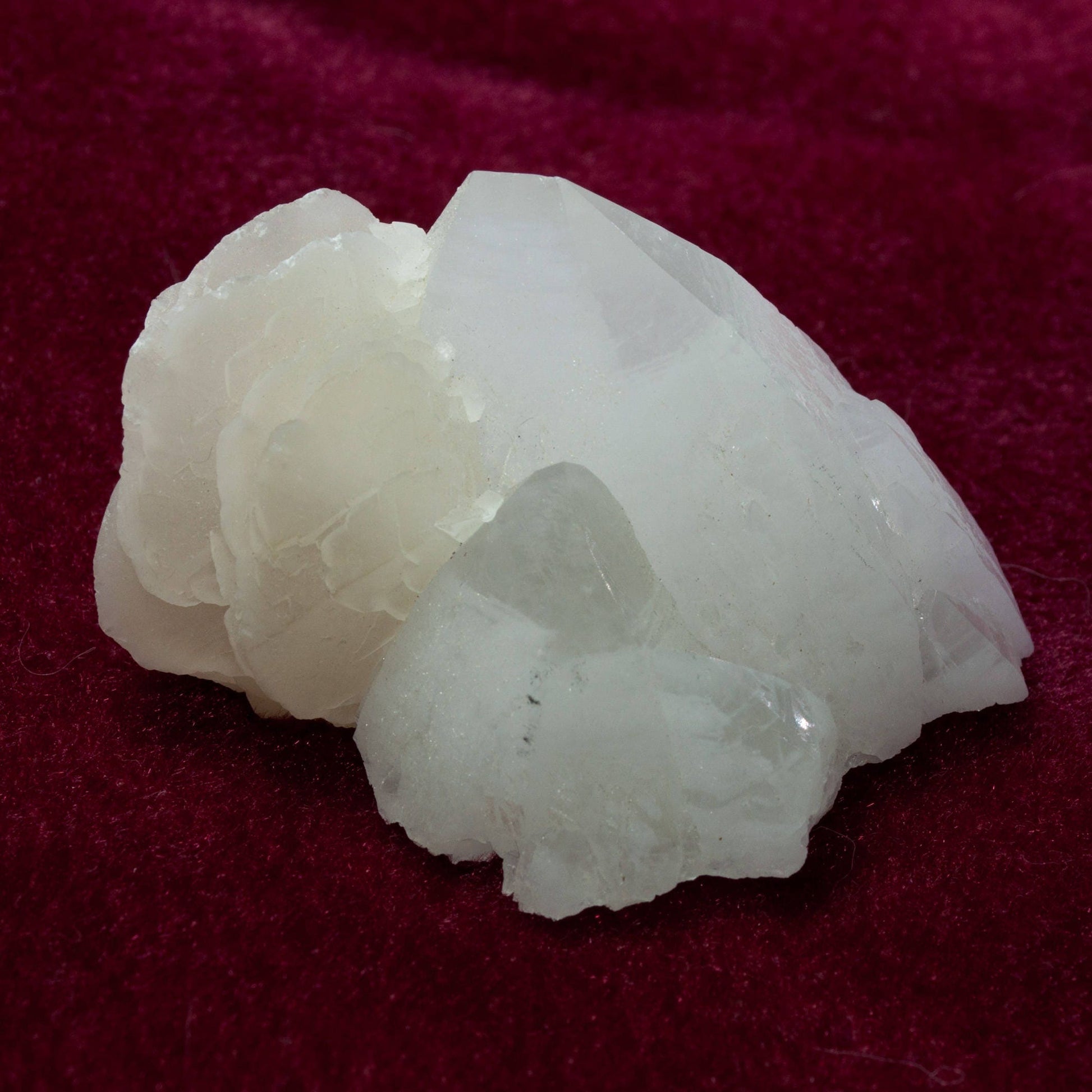 Offered here is a beautiful specimen of icy quartz crystals to 4.9 cm. The quartz have clear points and the creamy spray of "poker chip" calcite crystals are a lovely offset. Very unique and aesthetic piece! Displays beautifully on its own.