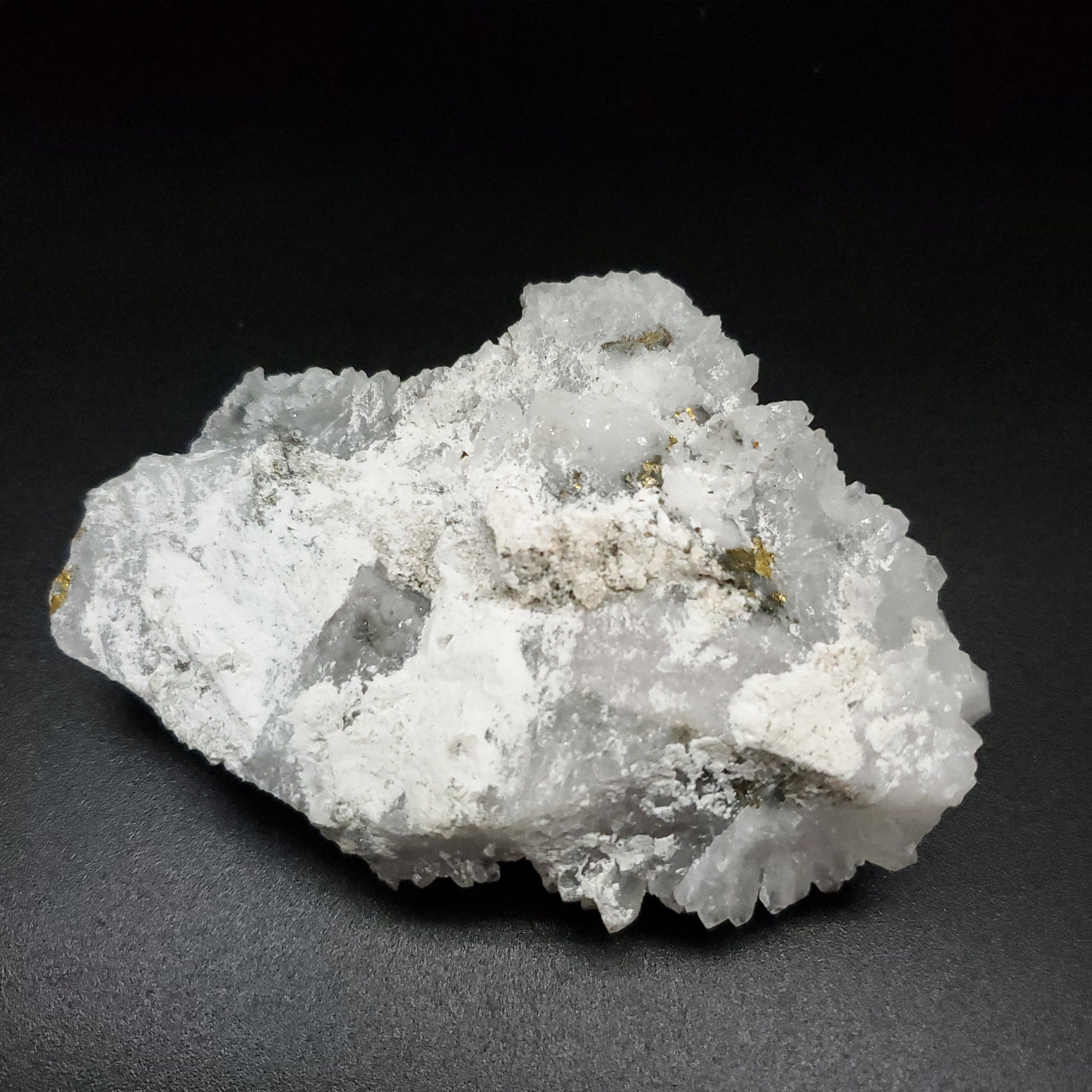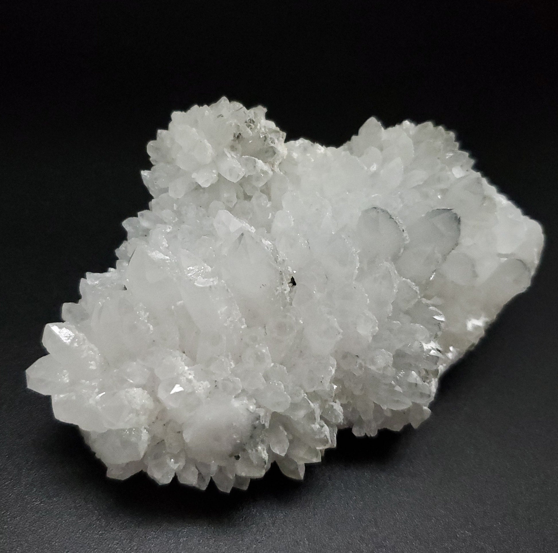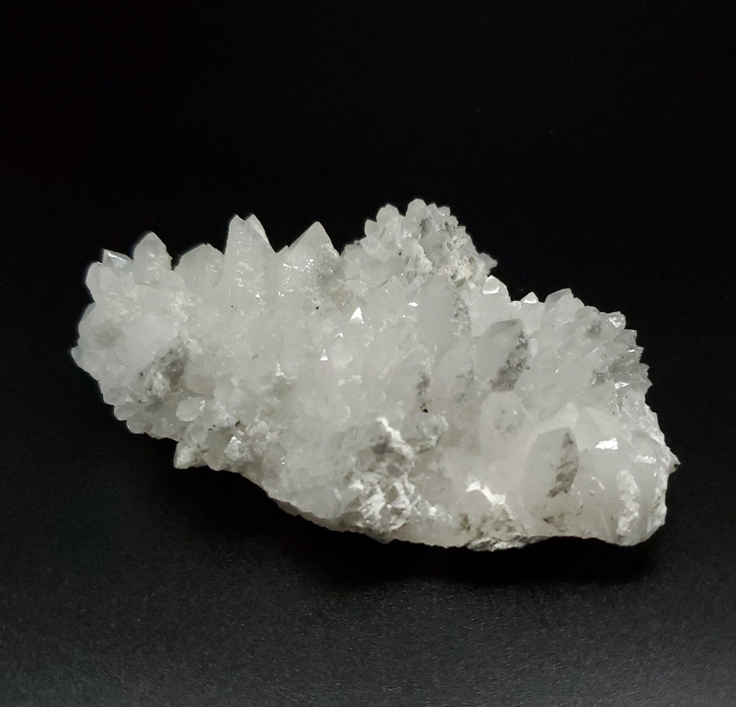 Offered here is a nice cluster of quartz crystals with calcite and minor pyrite.