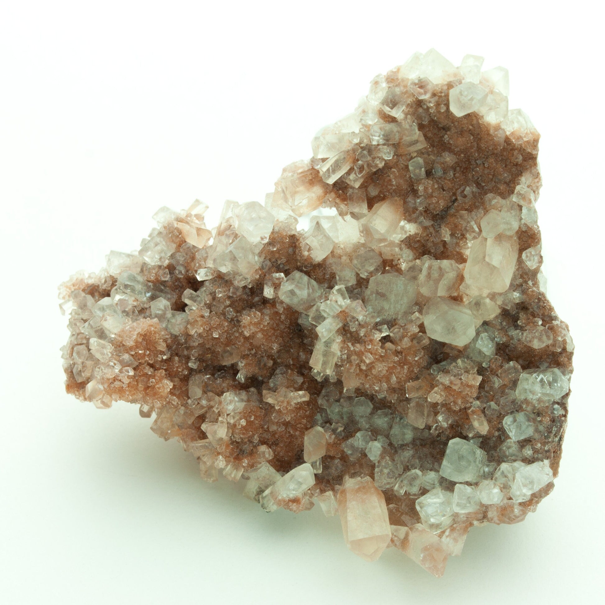 Offered here is a beautiful, hexagonal calcite crystal cluster that contains hematite inclusions which causes the reddish color. Pretty specimen all around!