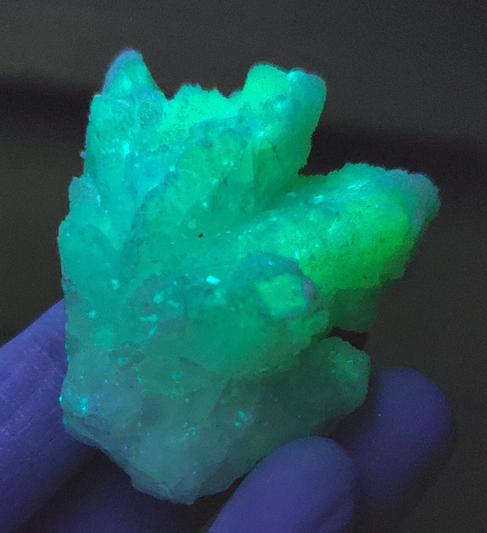 Offered here is a rare specimen of intergrown blue celestine and lustrous calcite which displays beautifully! Portions of the specimen fluoresce neon green indicative of a thin coating of hyalite opal.