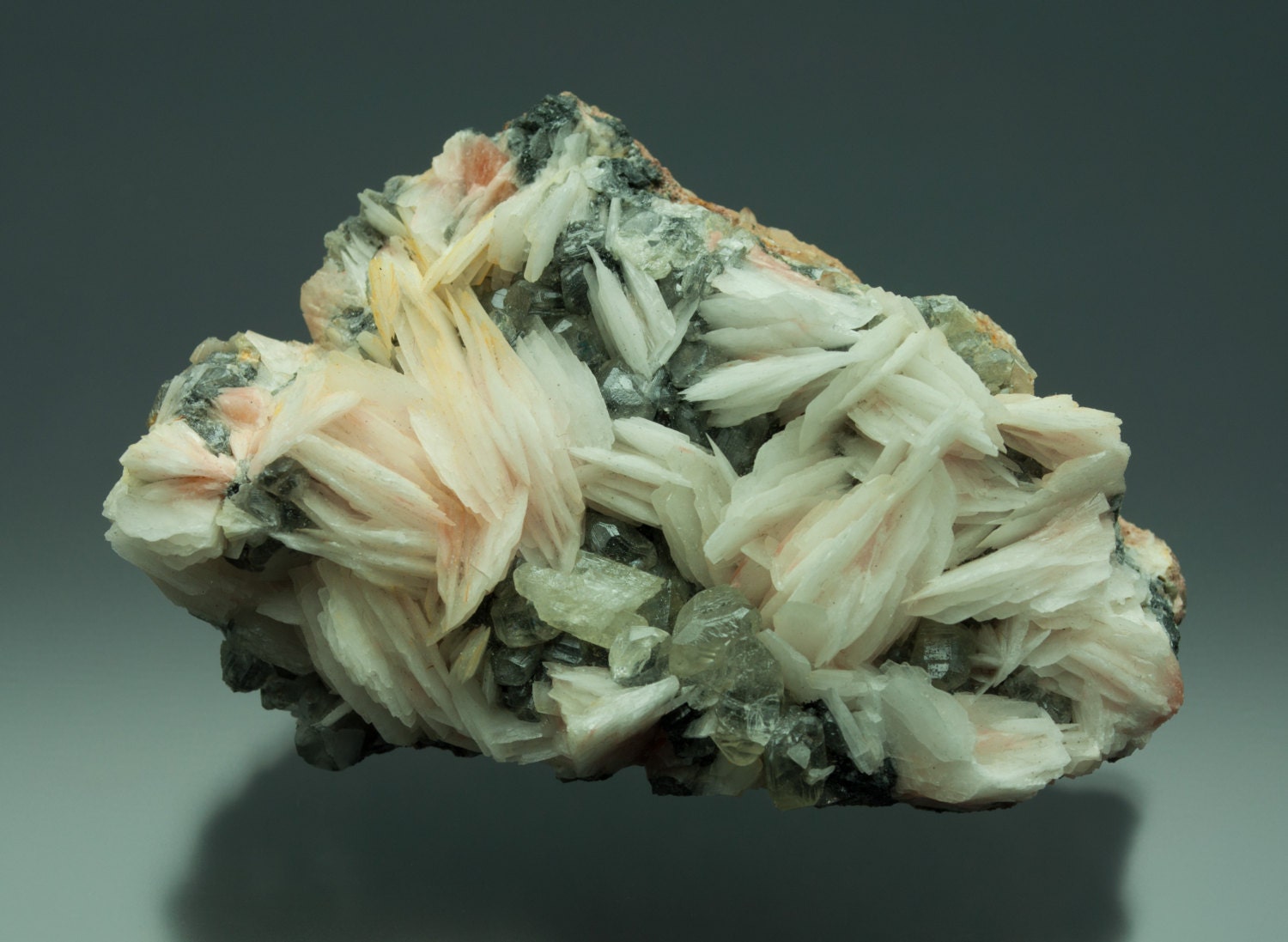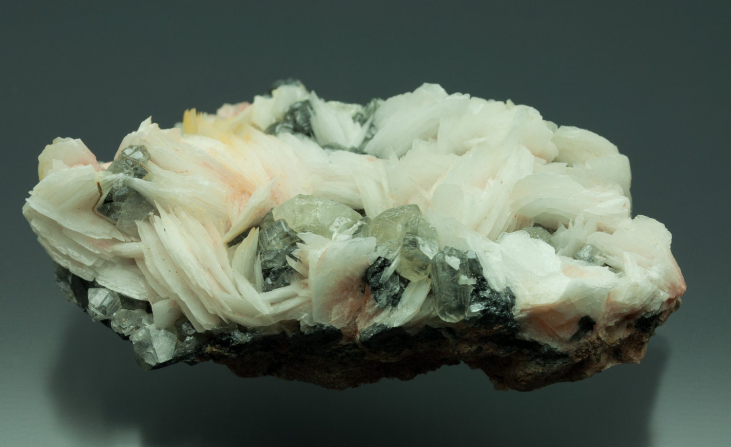 Transparent, cerussite crystals to 1cm intermixed with bladed soft peach colored barite crystals cover galena on matrix.