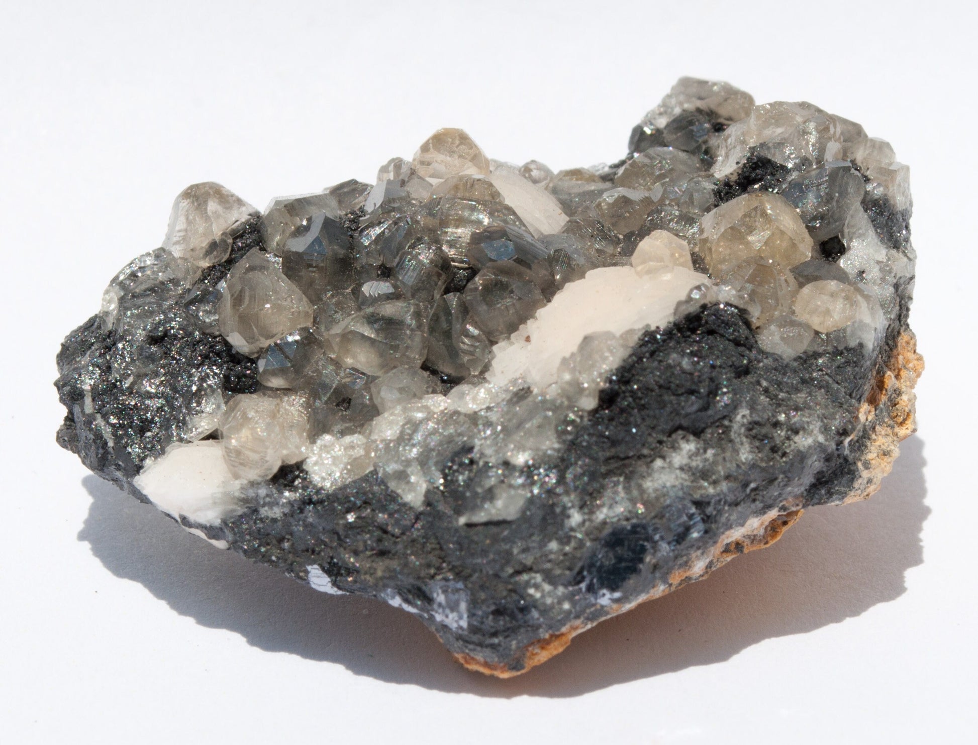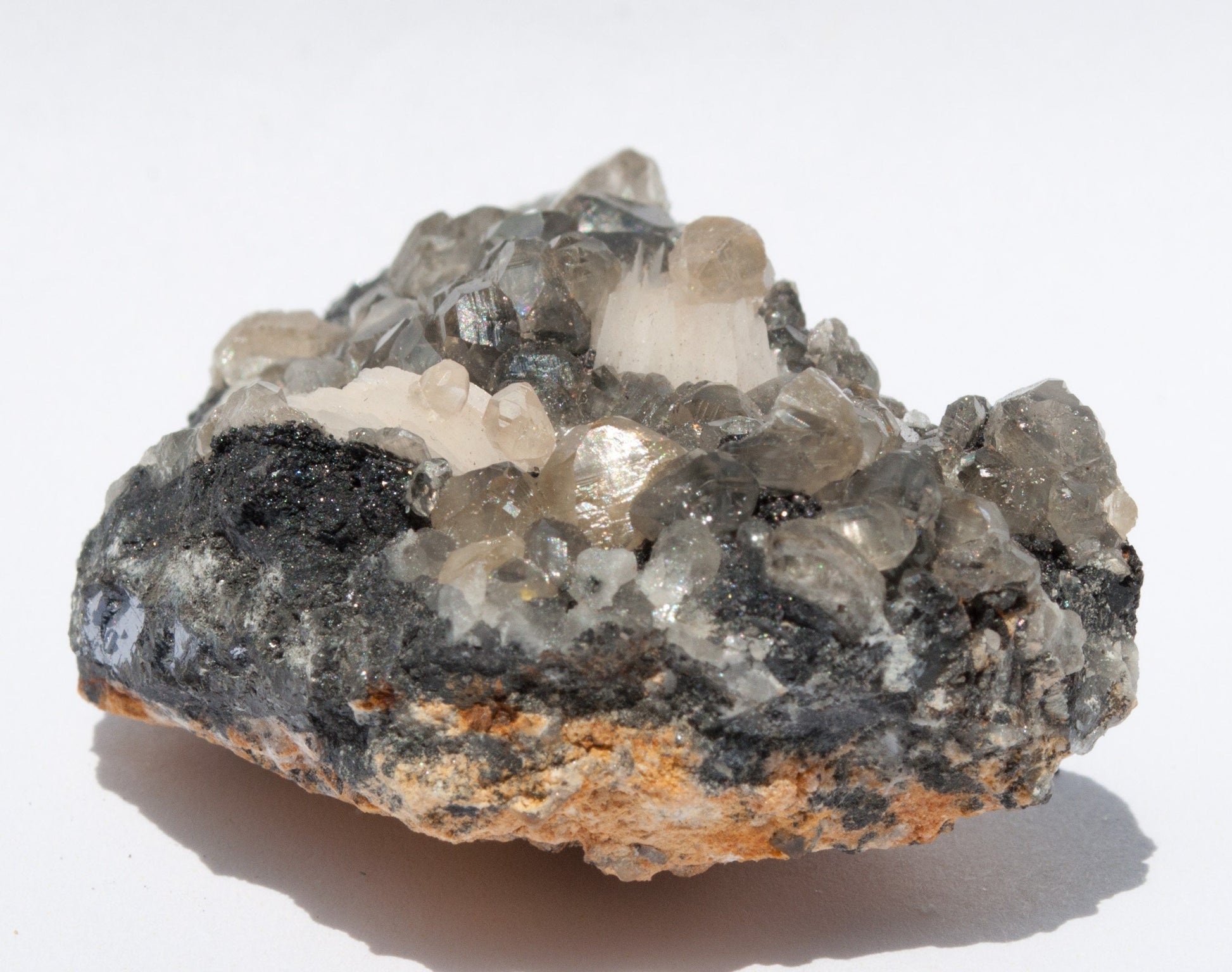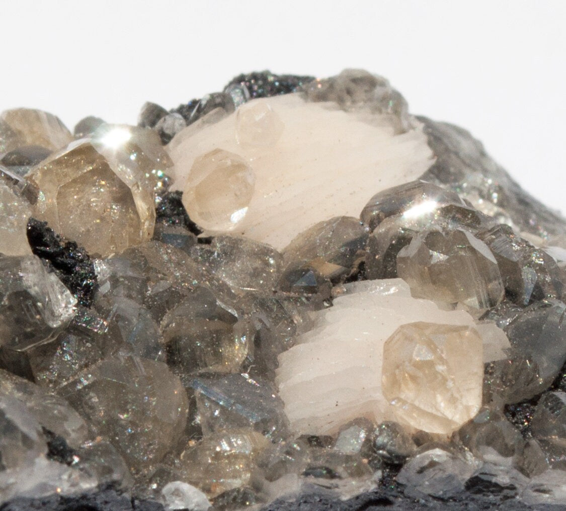 Beautiful, translucent crystals of cerussite intermixed with soft peach colored barite blades layered with steel colored galena on matrix!