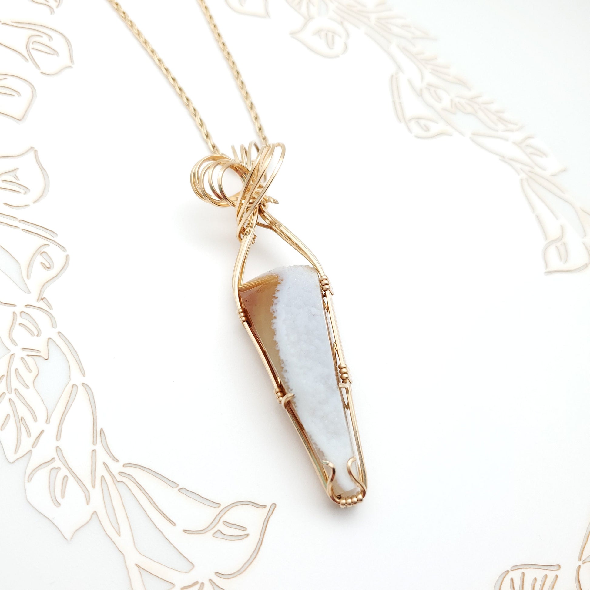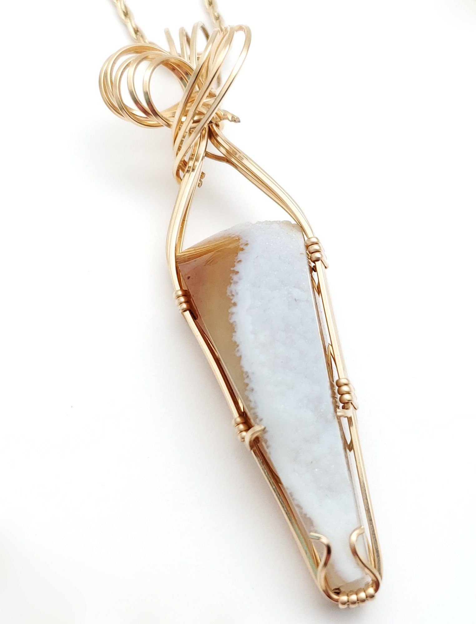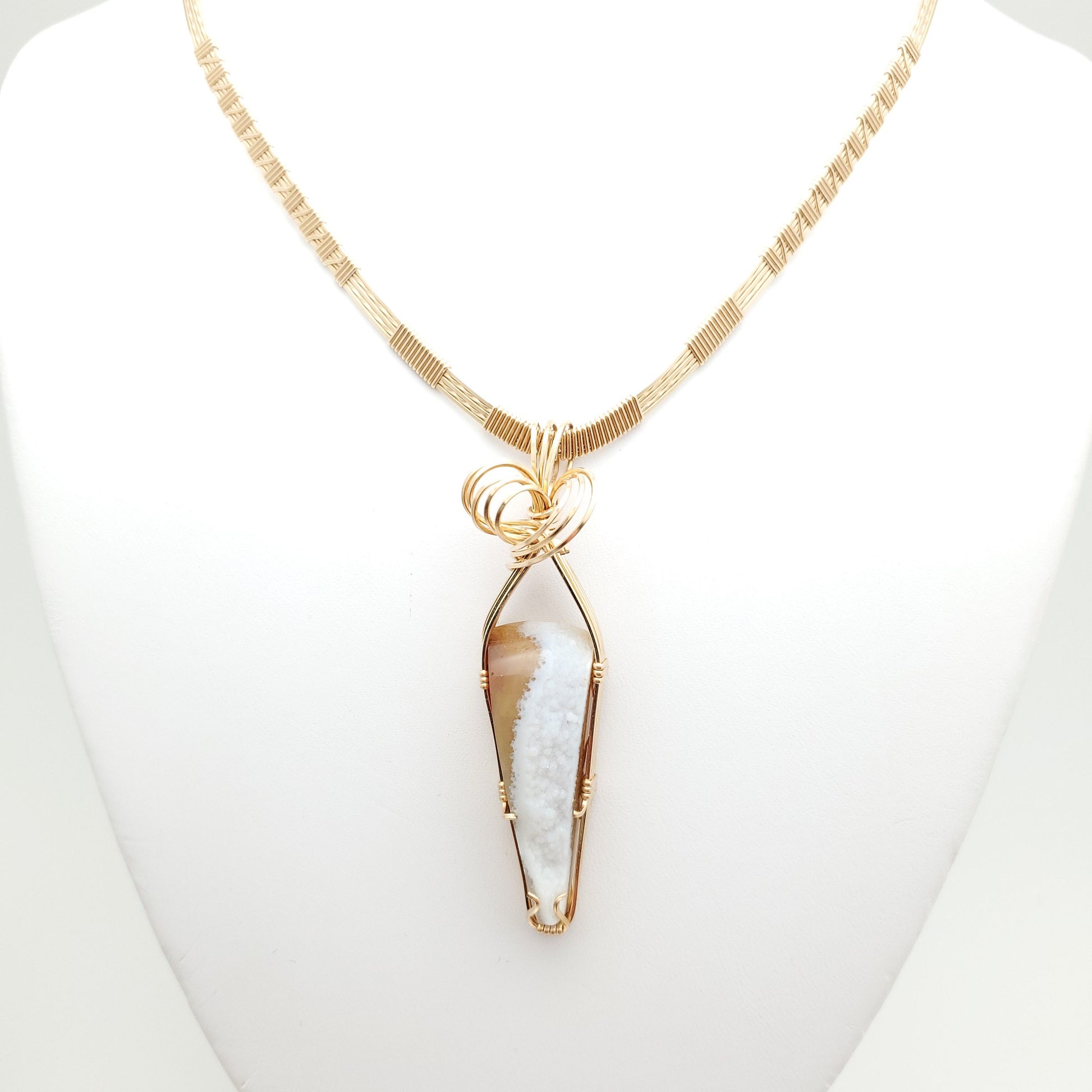 I have set the gorgeous and uniquely shaped stone in 14kt gold fill wire! Luscious caramel colored agate is partially covered by snow white, sparkling druze quartz!