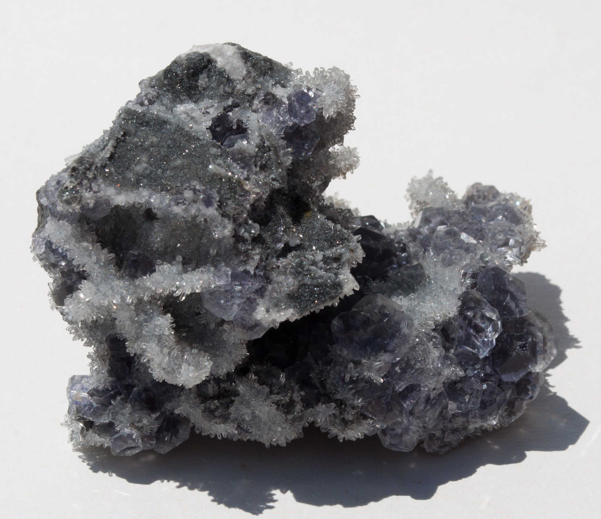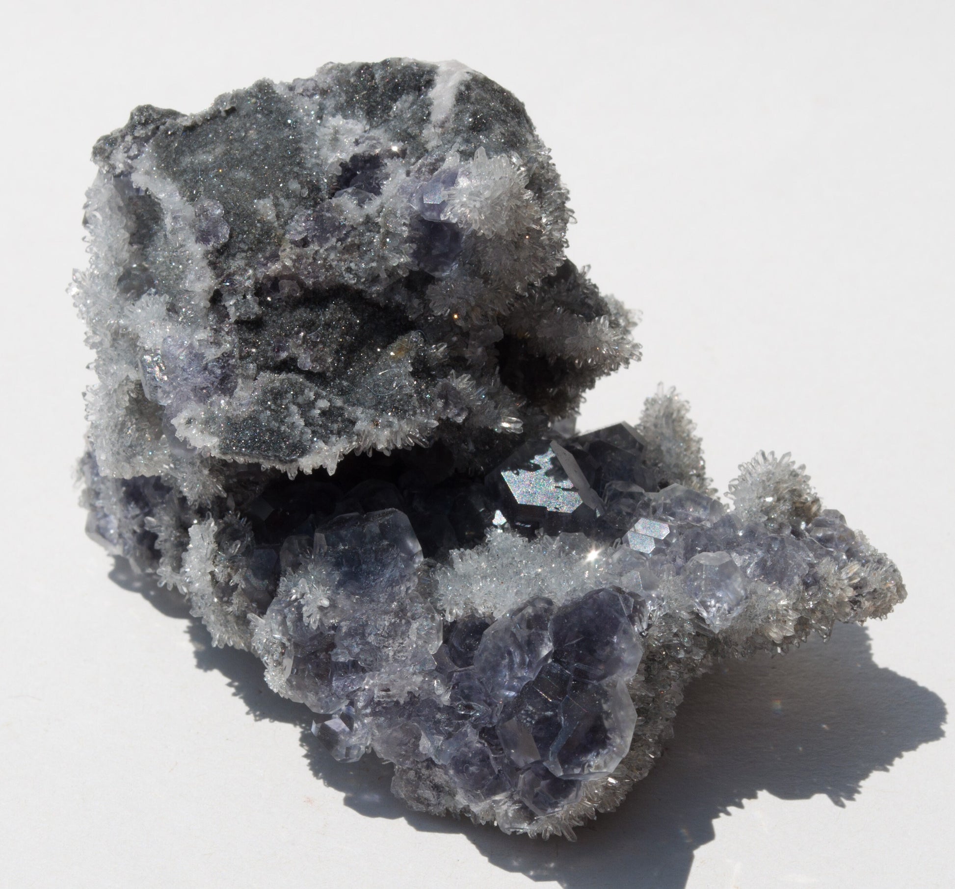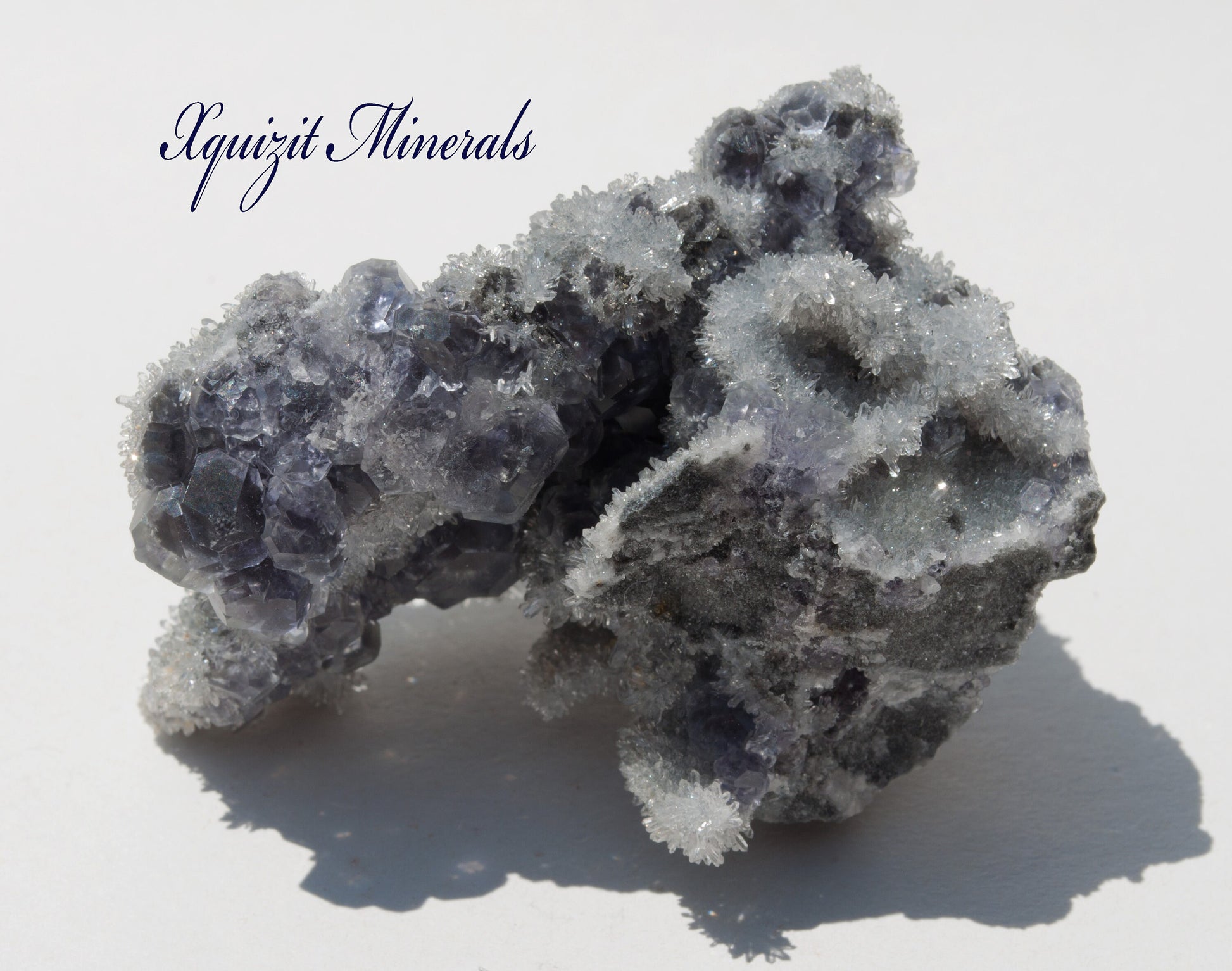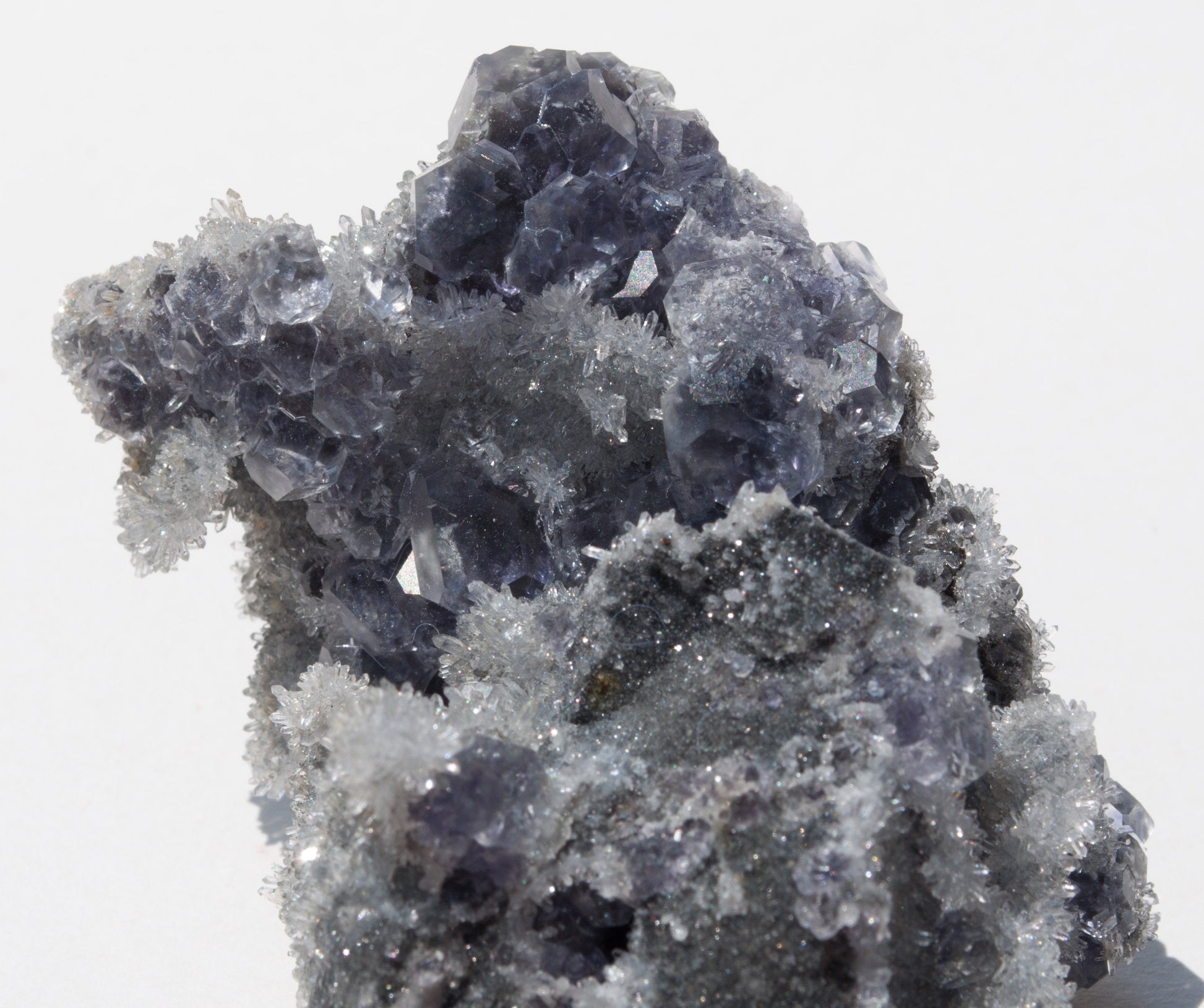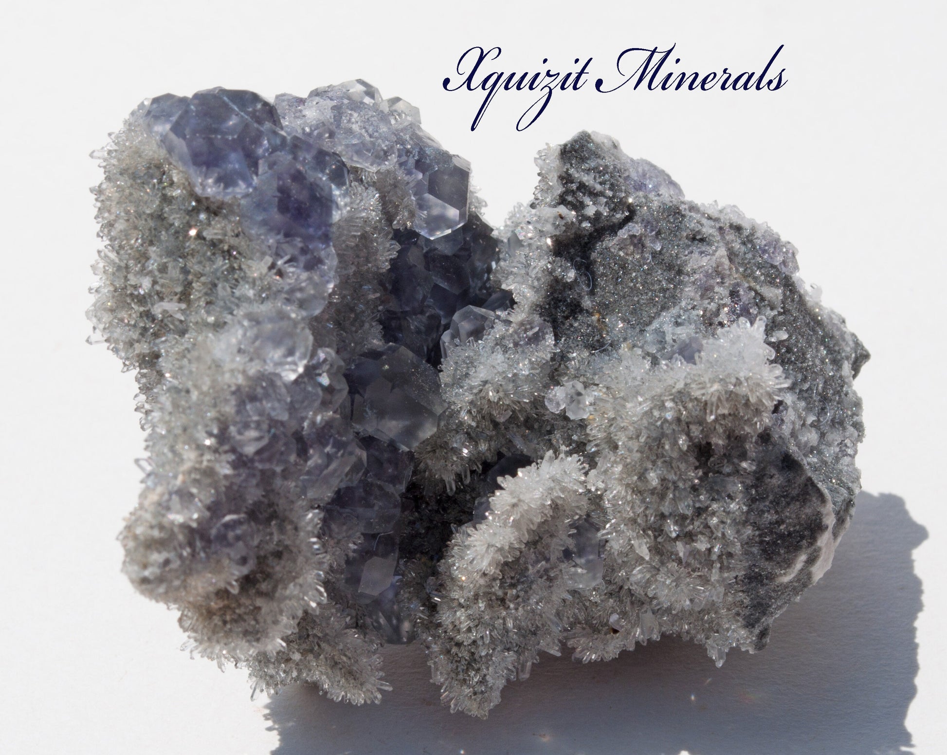 Offered here is a gorgeous specimen of glassy, bluish-purple dodecahedral fluorite crystals measuring up to 1 cm covering a matrix of sparkling needlelike quartz crystals. Unique and aesthetic color, this piece is so beautiful in person! It is from the recent 2017 find of “tanzanite fluorites” in the area. The name is only to denote the coloring of the fluorite - these are not and do not contain tanzanite.