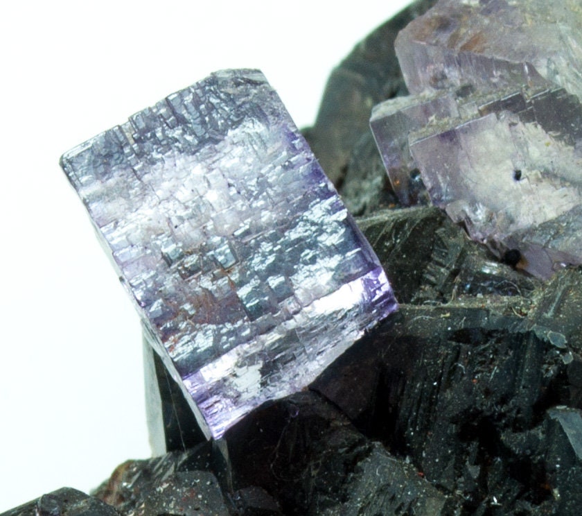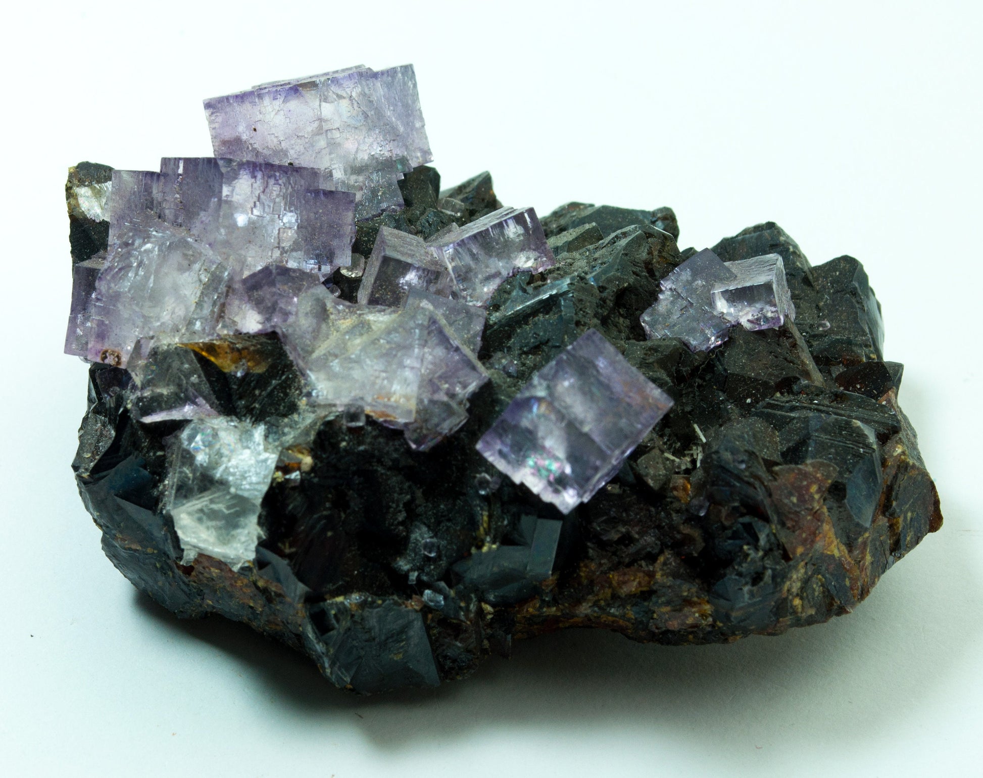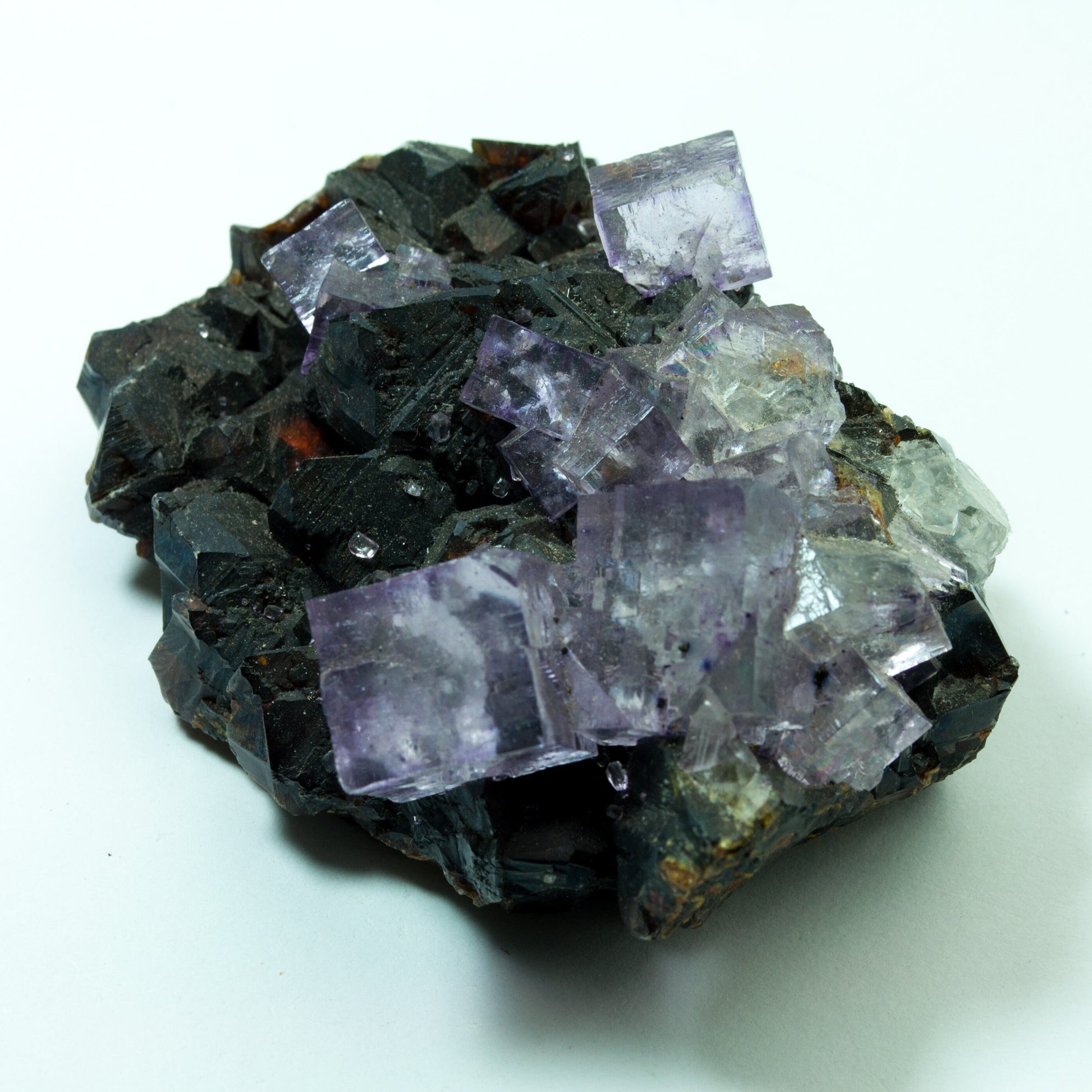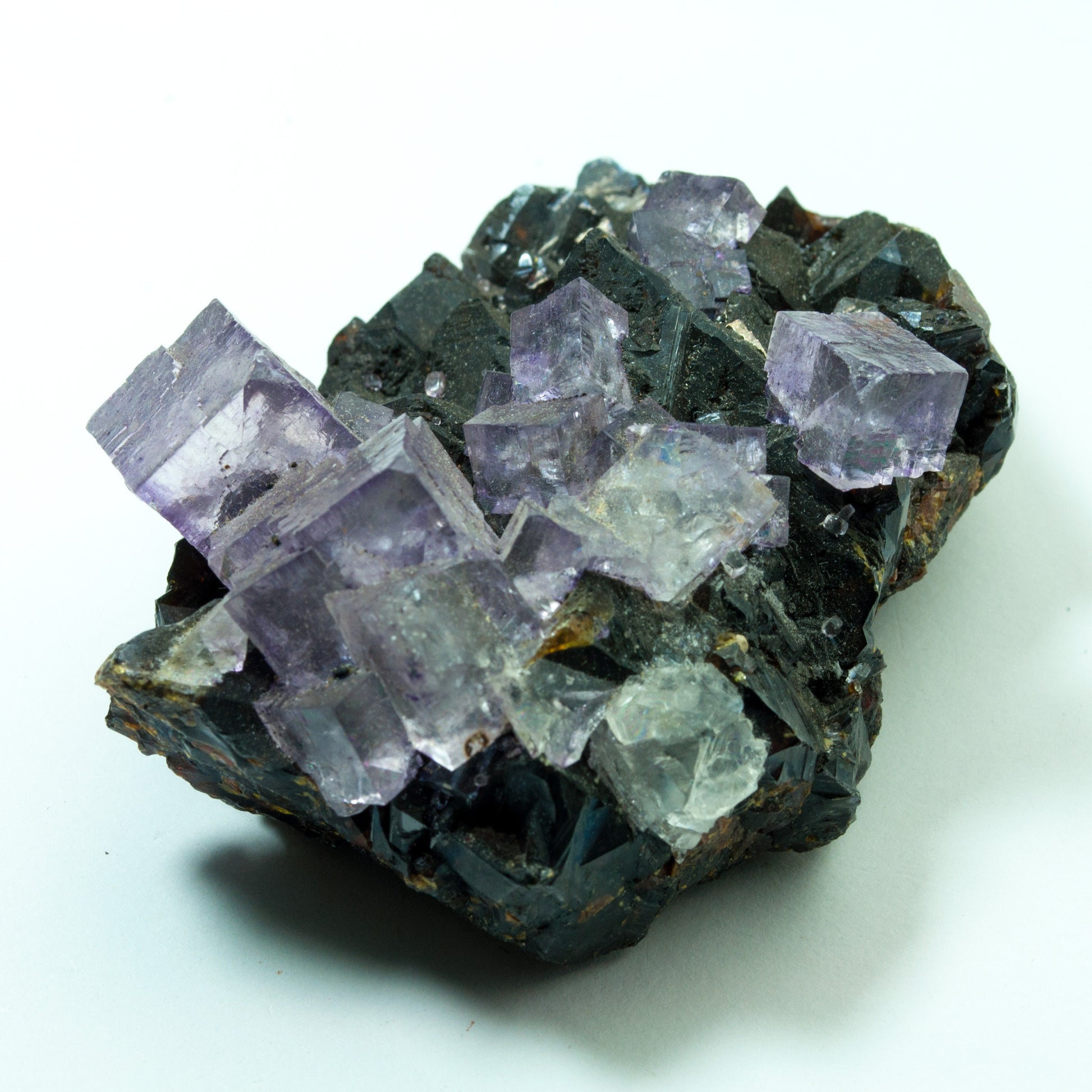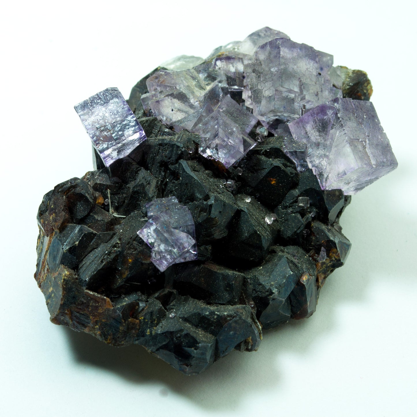 Offered here is an incredible, small cabinet size Fluorite on Sphalerite specimen from the famed Elmwood Mine in Tennessee. Several Fluorite cubes measuring to 1.6 cm are perched atop a crystallized, lustrous Sphalerite matrix. Although the Sphalerite may appear almost black, it is actually a beautiful reddish-brown that is transparent in areas when the specimen is backlit. The Fluorite cubes have darker purple edge phantoms and dense stepped-growth faces with interesting whitish phantoms in their centers. This is an older specimen and would be a great addition to any collection!