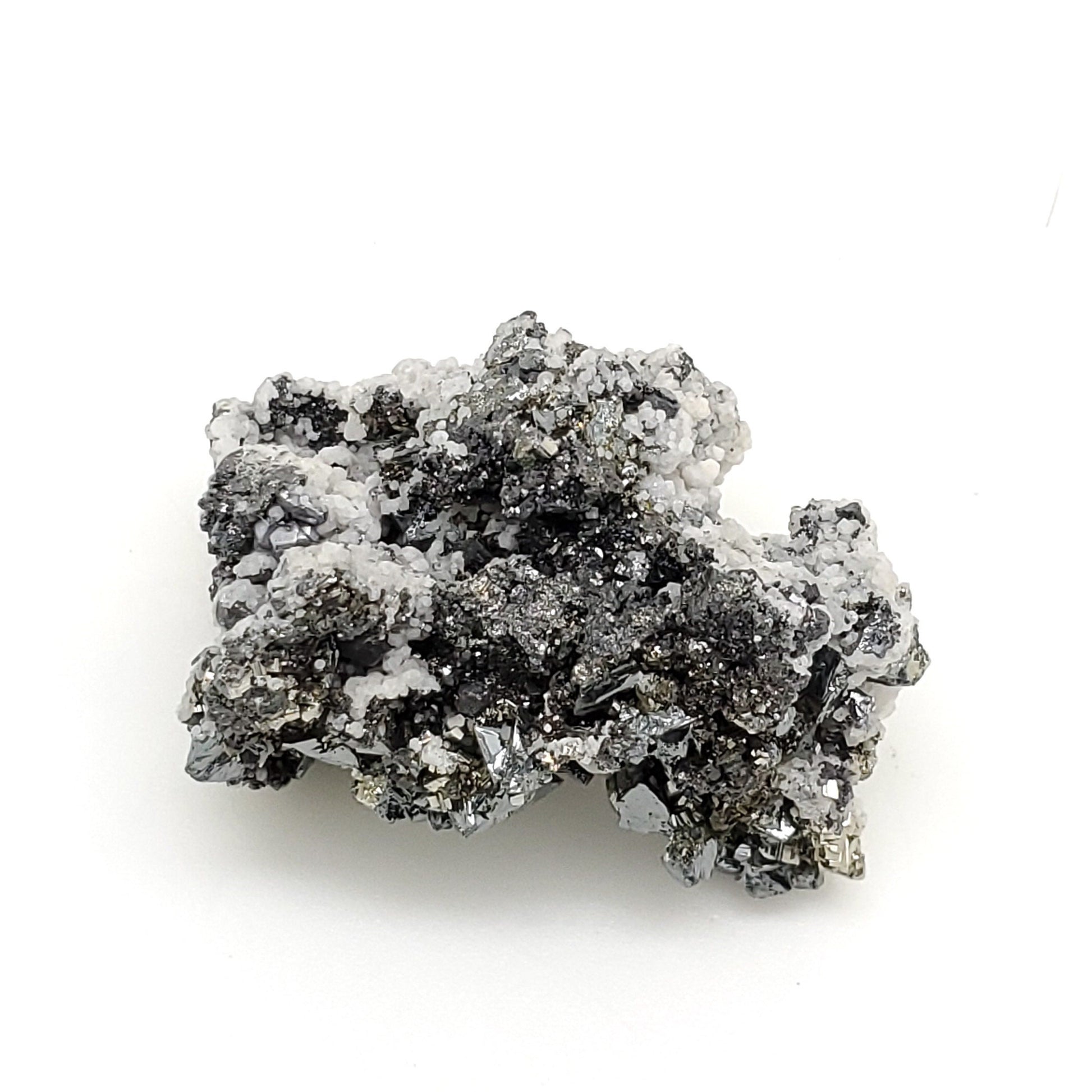 Offered here is an aesthetic specimen calcite on galena with golden pyrite. I love metallic minerals!