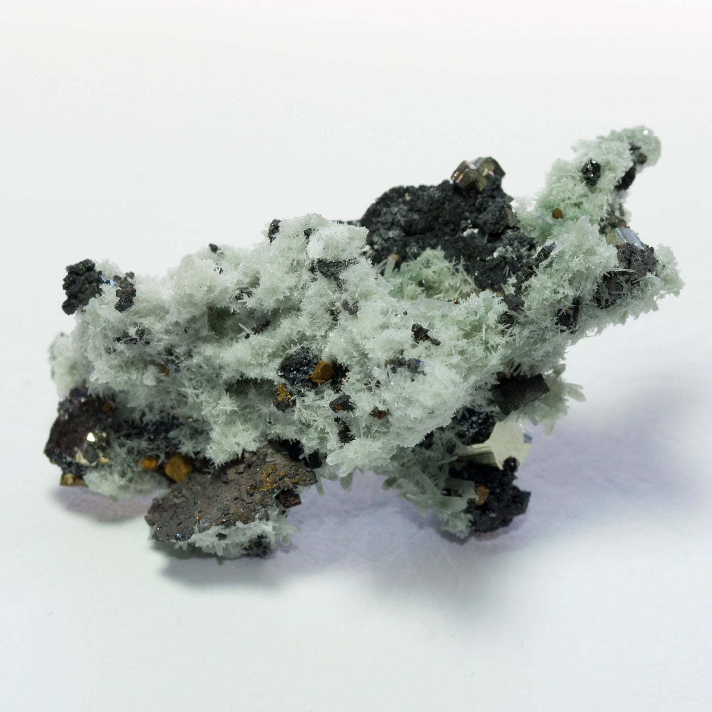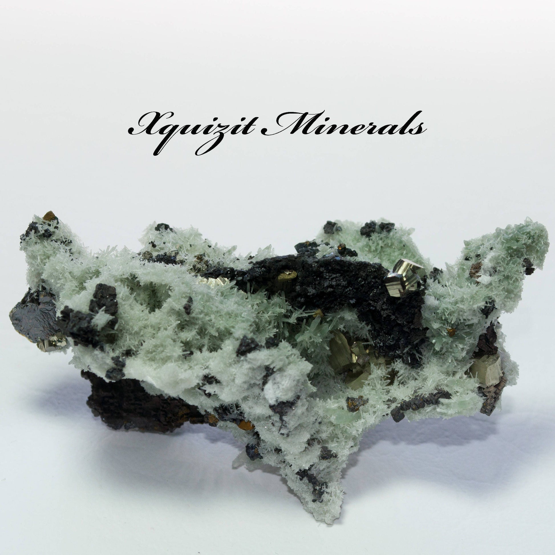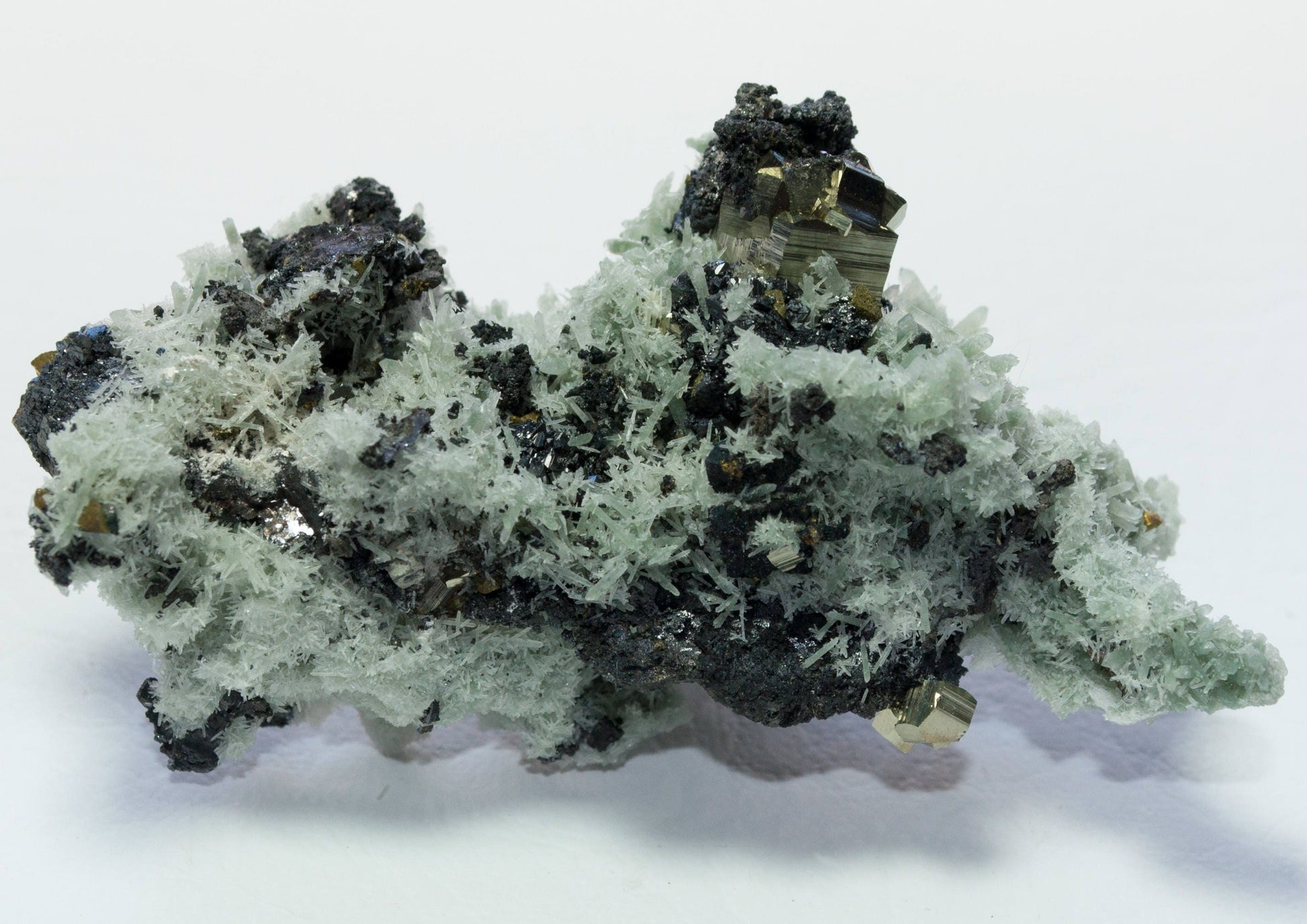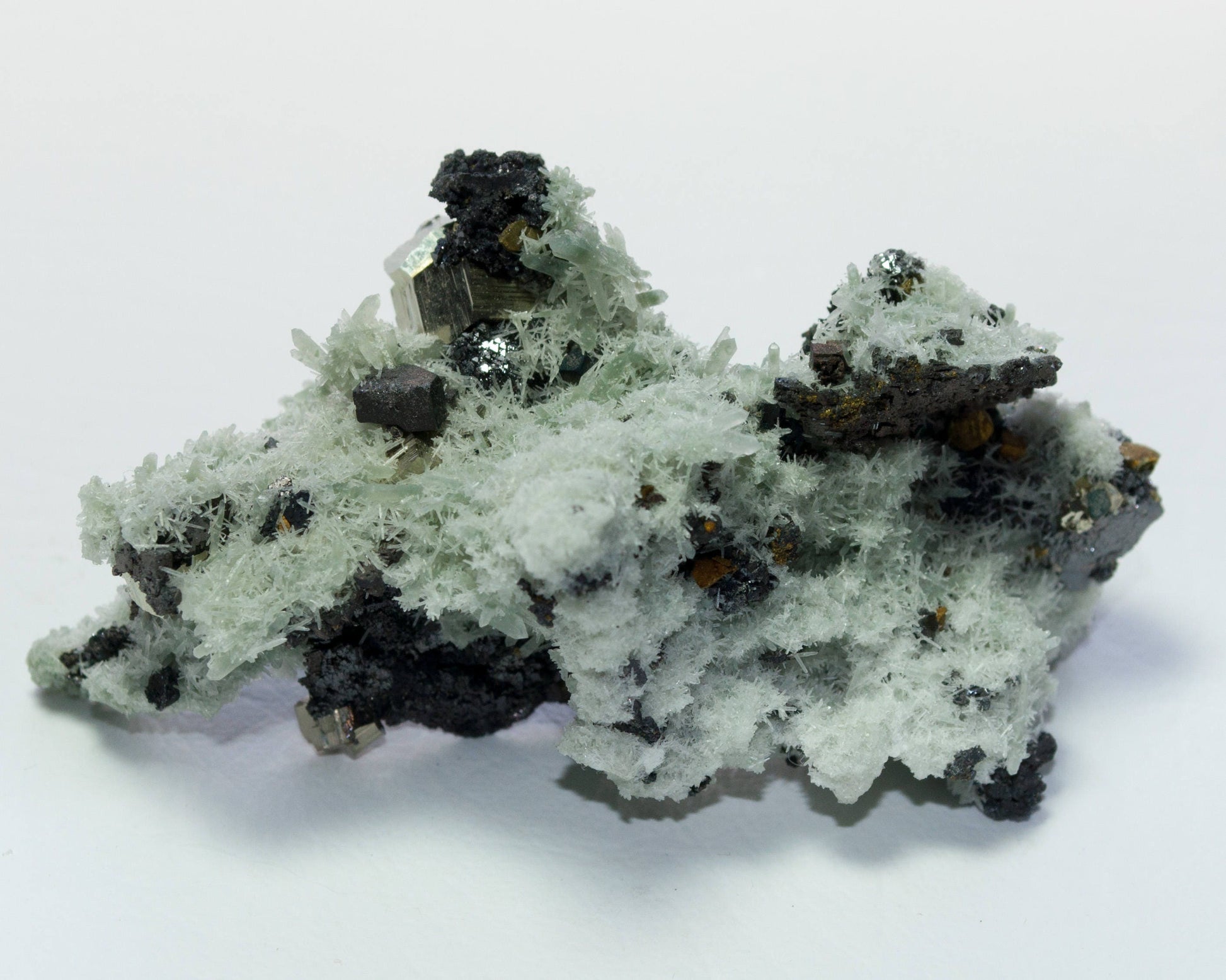 Multiple minerals are showcased in this truly unique specimen! Sphalerite, steely gray galena, quartz crystals and sparkling golden pyrite cubes!