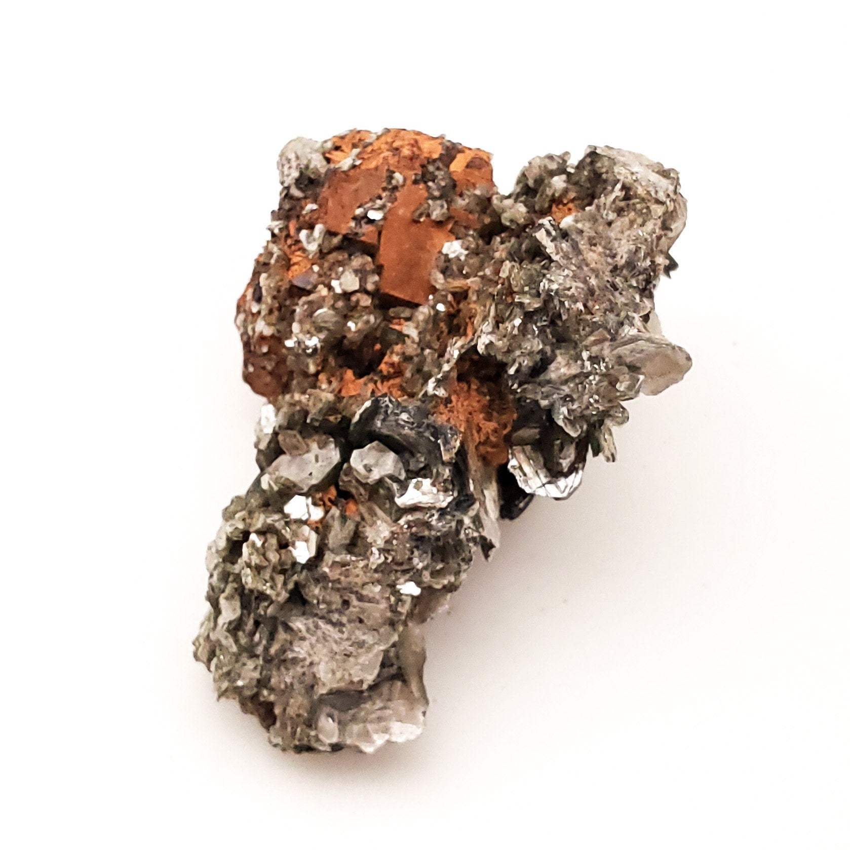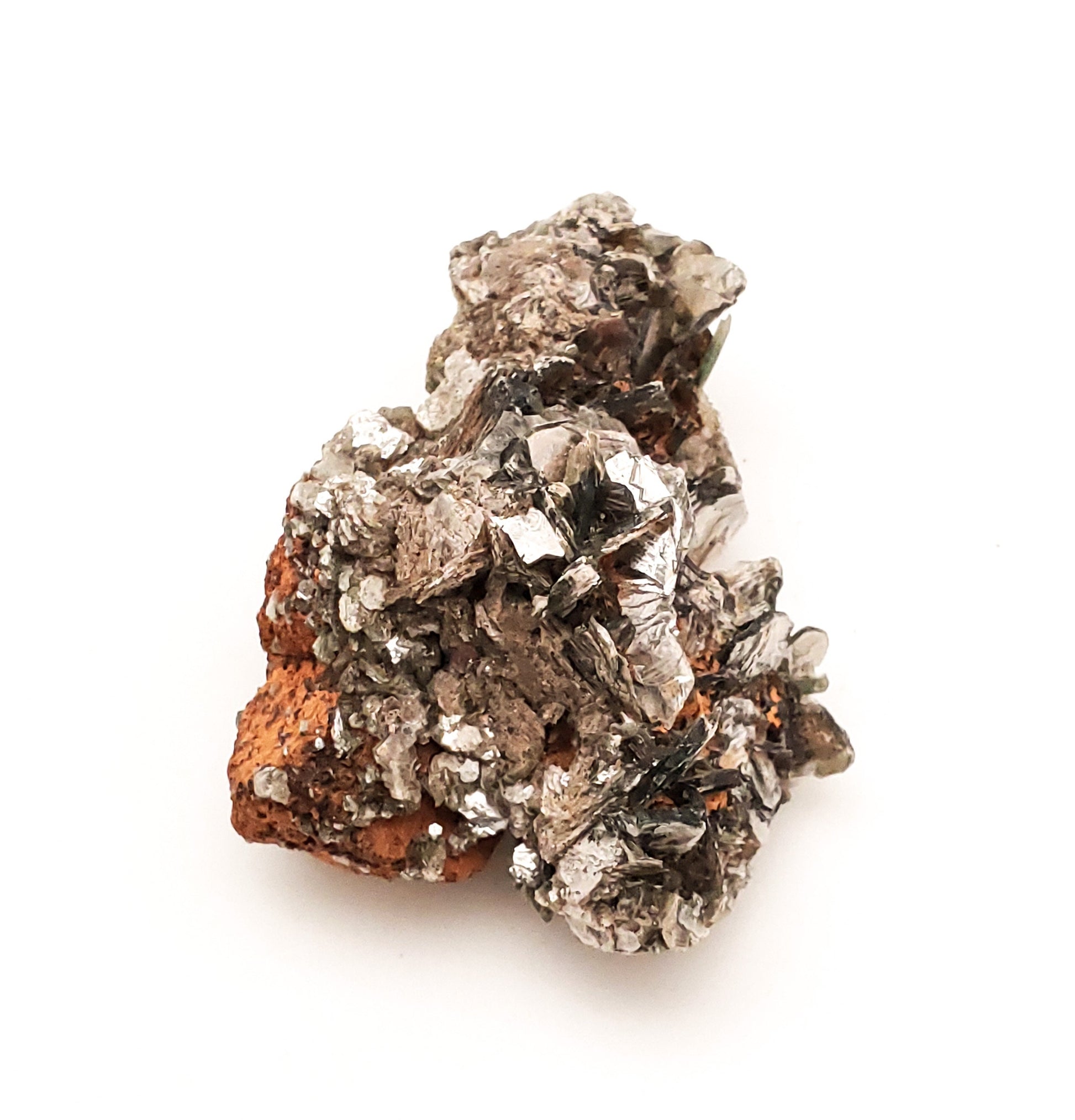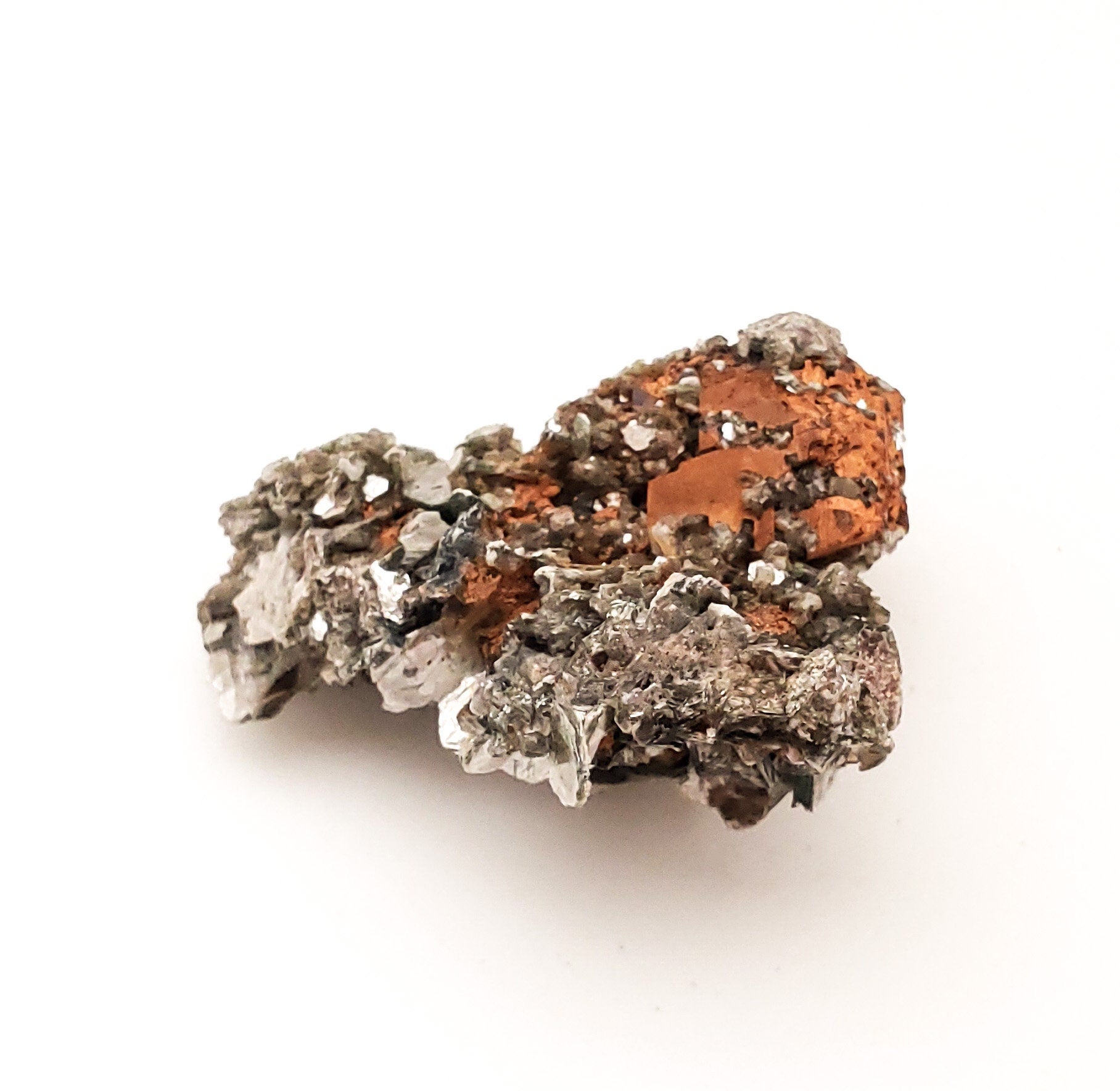 Offered here is a beautiful specimen of silvery/gold lepidolite on contrasting orange matrix! The crystals form an aesthetic "rosette" on the piece.