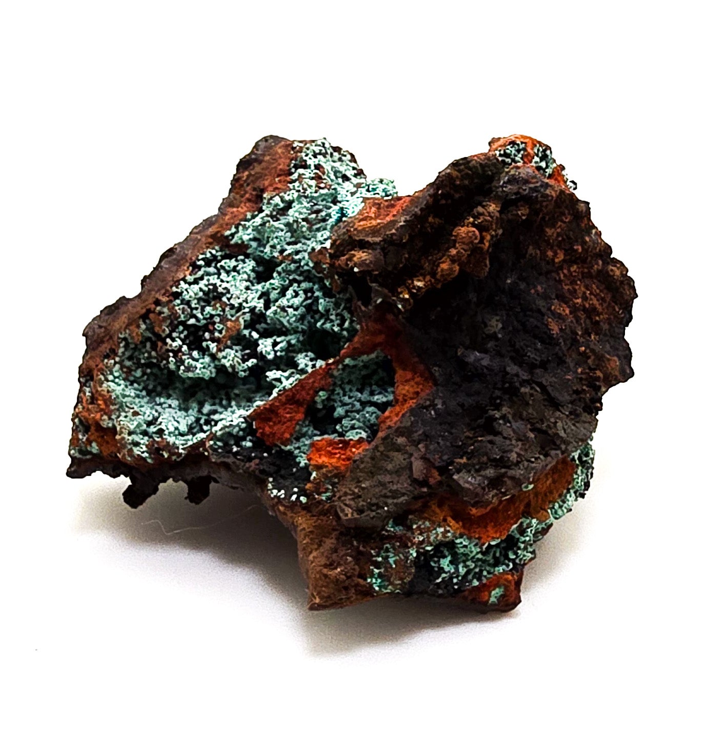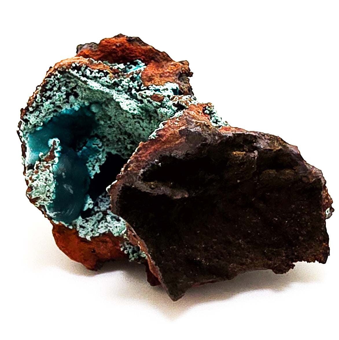 Rosasite, originally discovered in Italy, is a carbonate mineral which is rich in copper and zinc. Rosasite was named for the type locality at the Rosas mine in Sardinia. It forms as fibrous clusters and botryoidal globulars and often grows along with red limonite. Rosasite can be found in the USA, Namibia, England, Mexico and in other locations in smaller amounts. It is best not to touch the Rosasite directly as this will damage the tiny fibrous crystals.