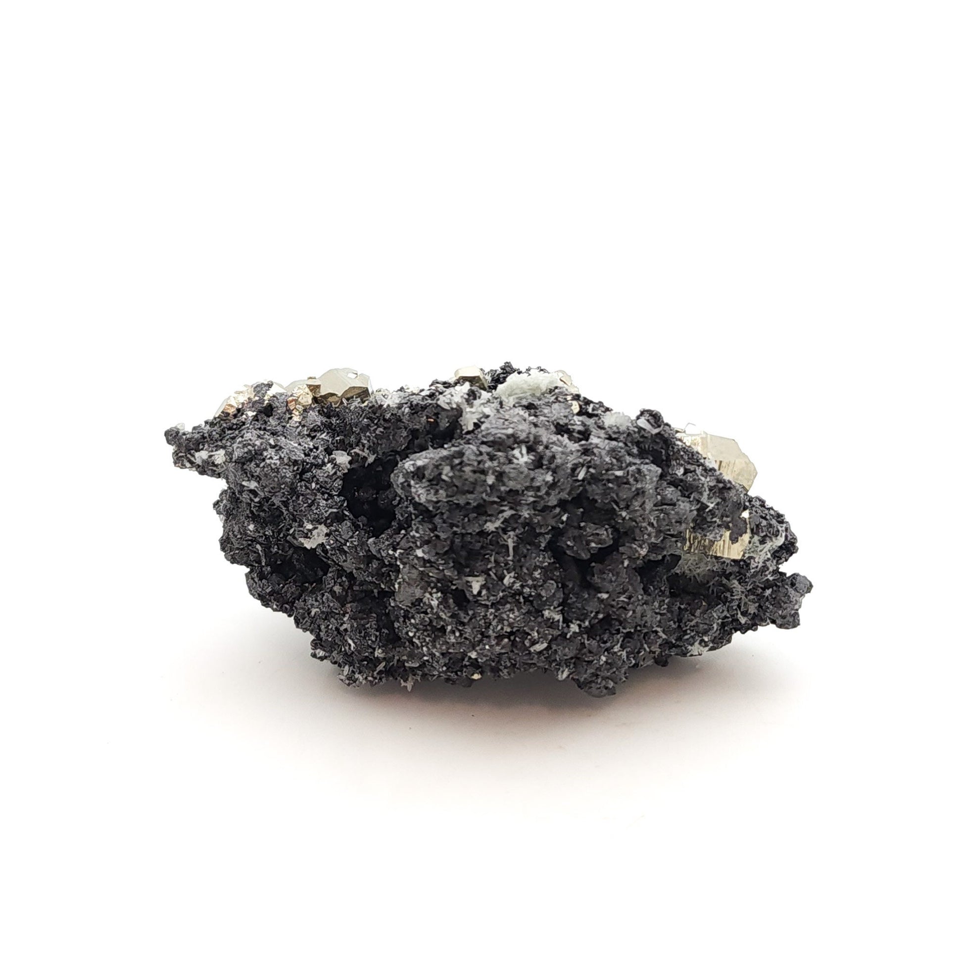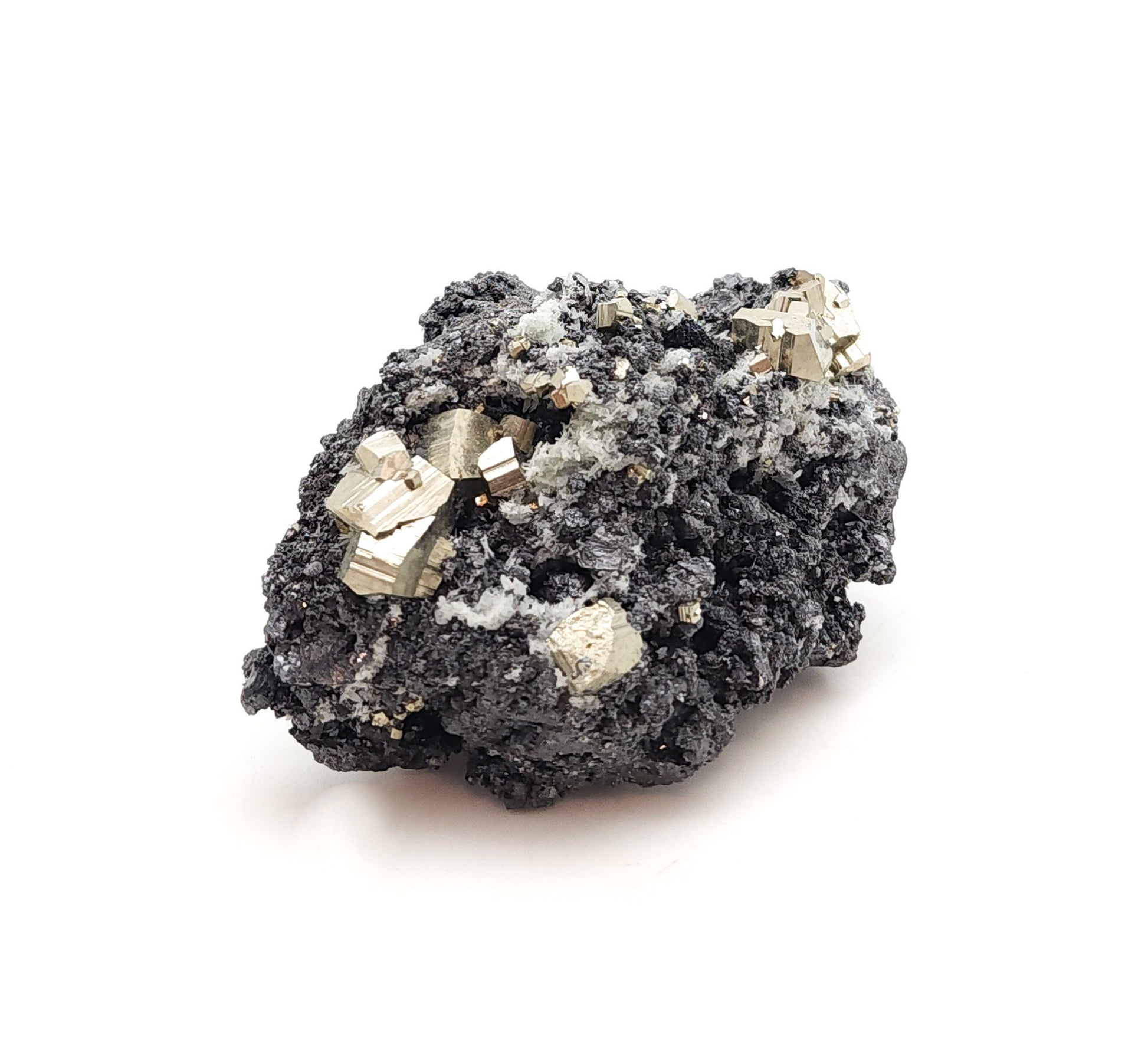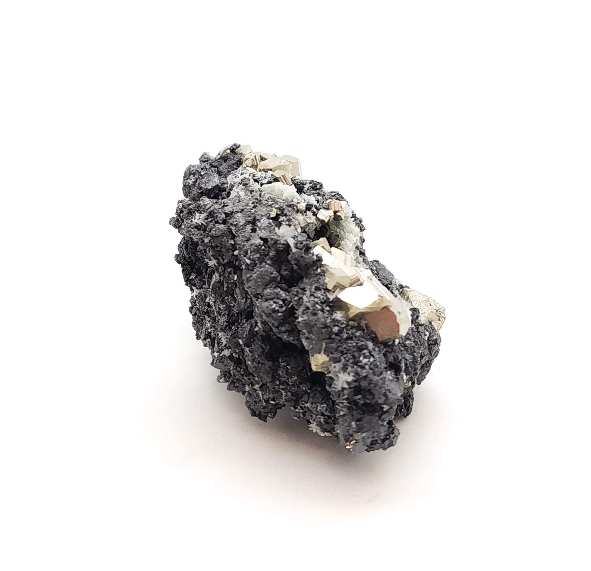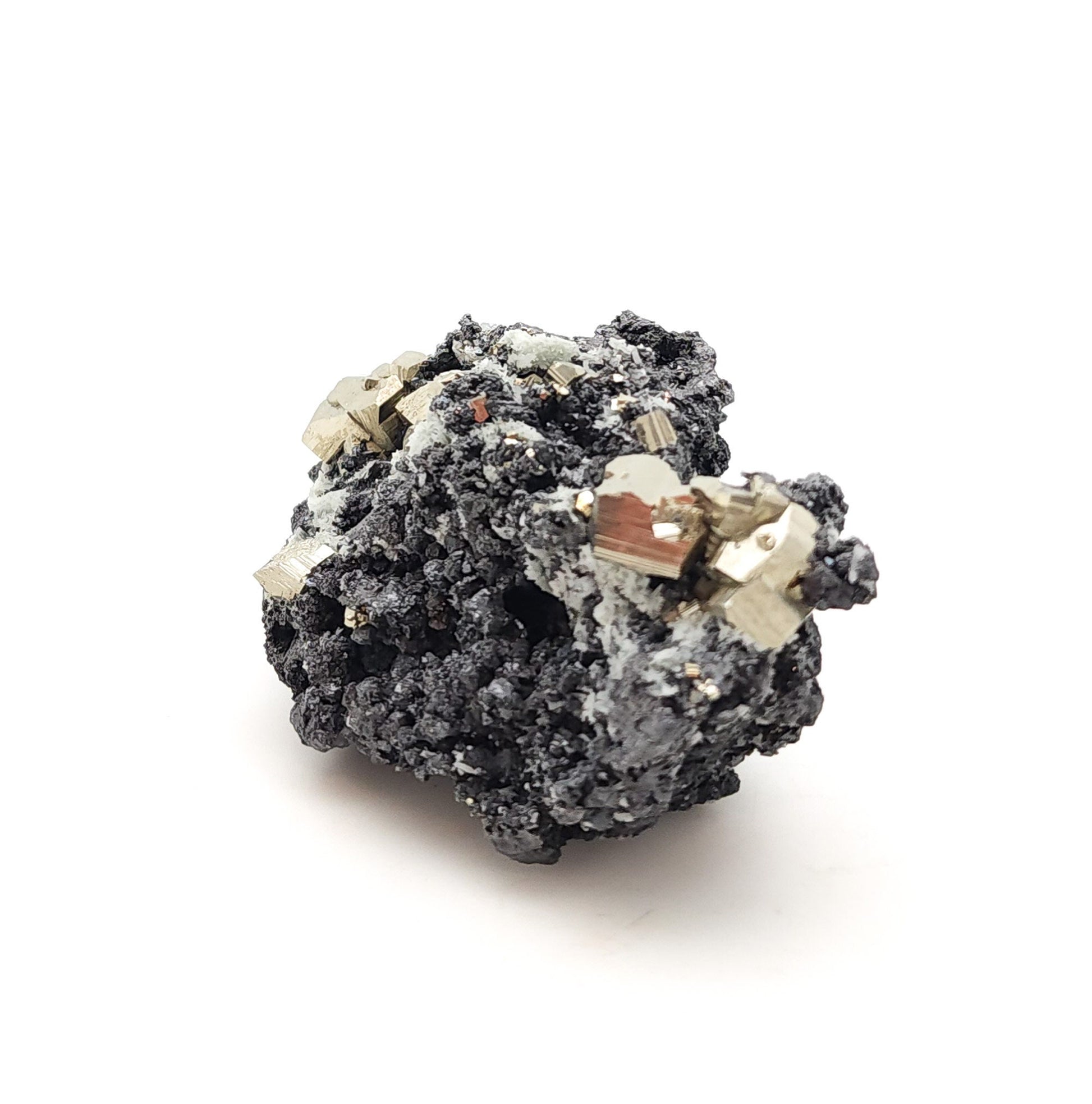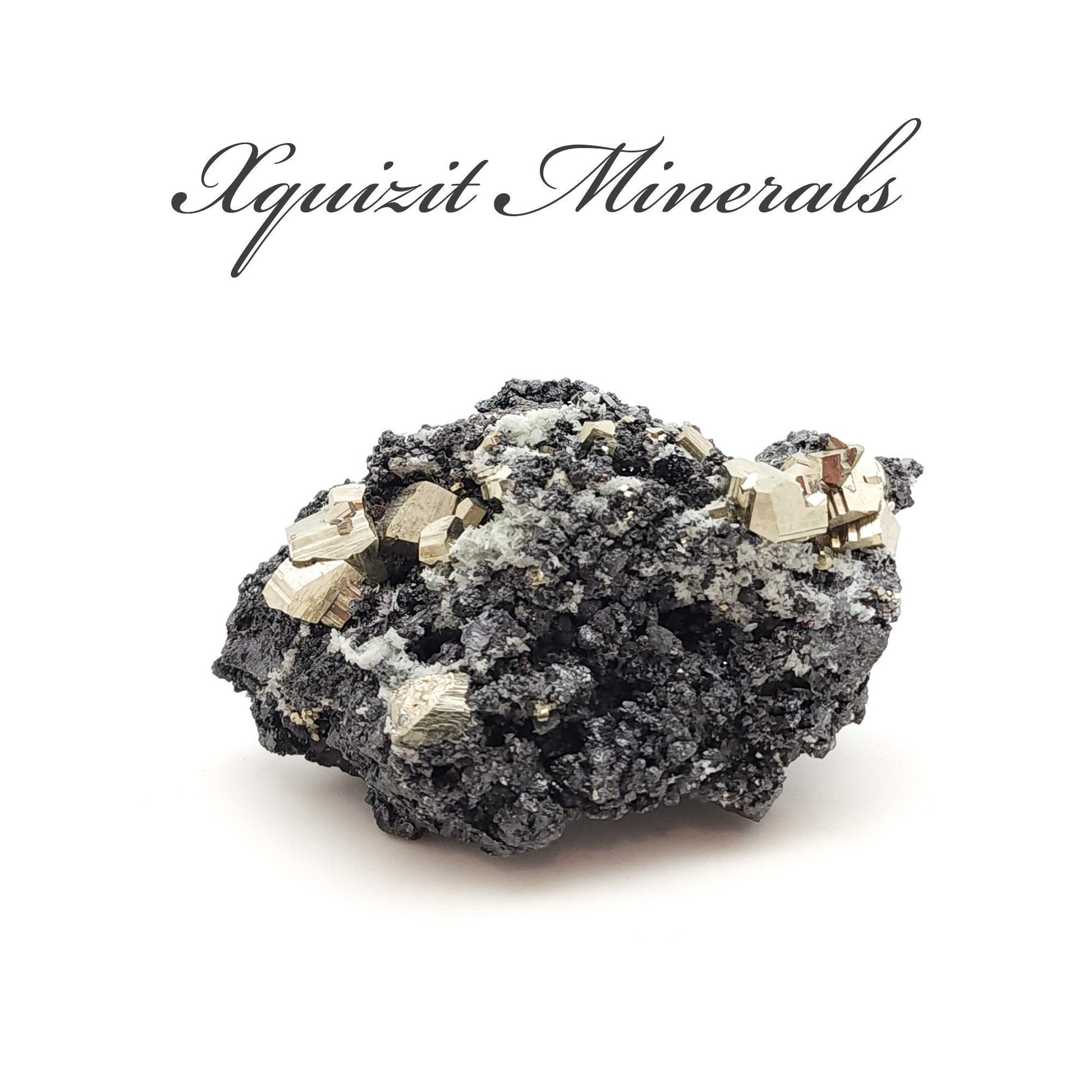 Multiple minerals are hosted in this beautiful and unique specimen. Golden pyrite cubes are nestled atop white quartz crystals and sphalerite. This specimen has high sparkle, especially as you hold and rotate!