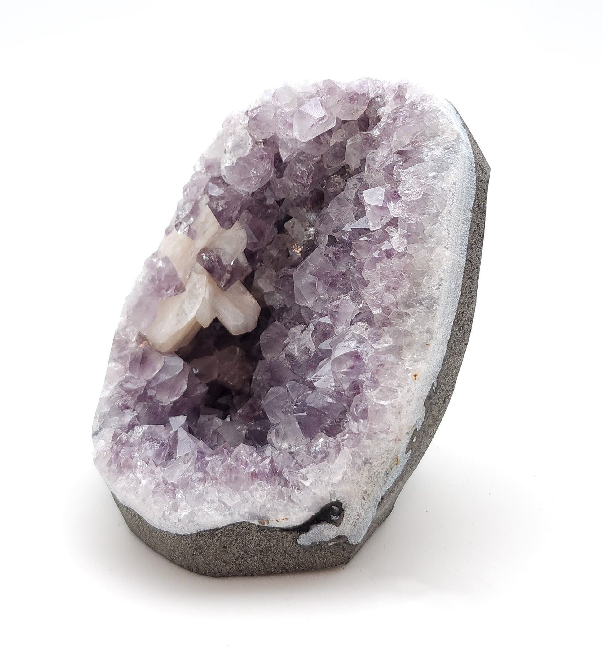 Offered here is a specimen of lustrous, light purple amethyst crystals with stilbite crystals from the classic Deccan trap locality in India. Sits flat for a nice, decorative piece!