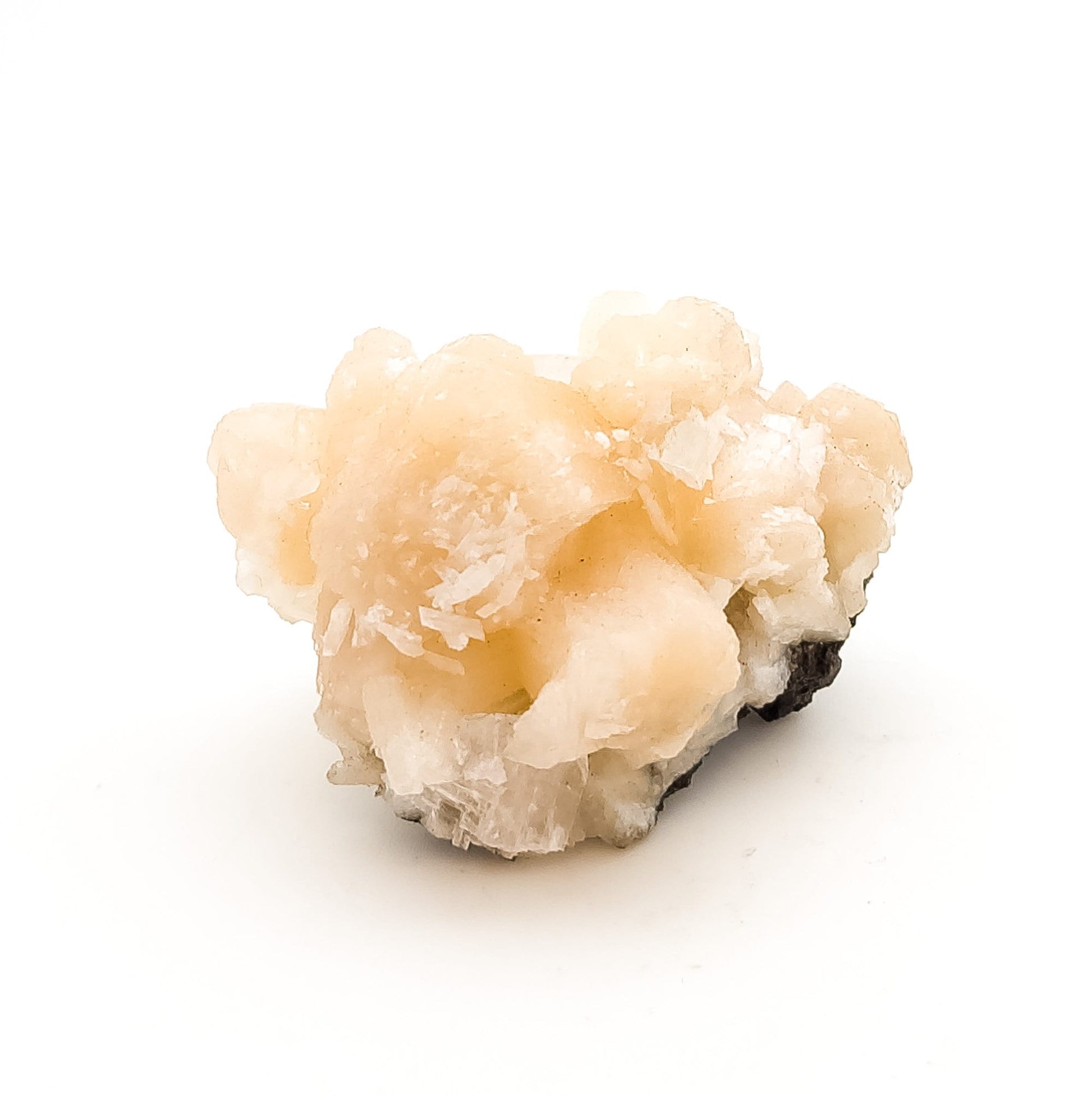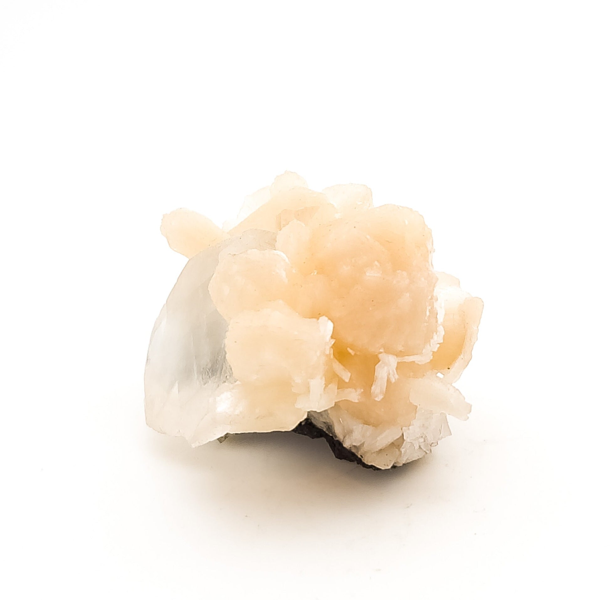 Offered here is a beautiful small cabinet size specimen of lustrous, light soft peach colored stilbite crystals with a single 3.8 x 3.6 cm calcite crystal from the classic Deccan trap locality in India!