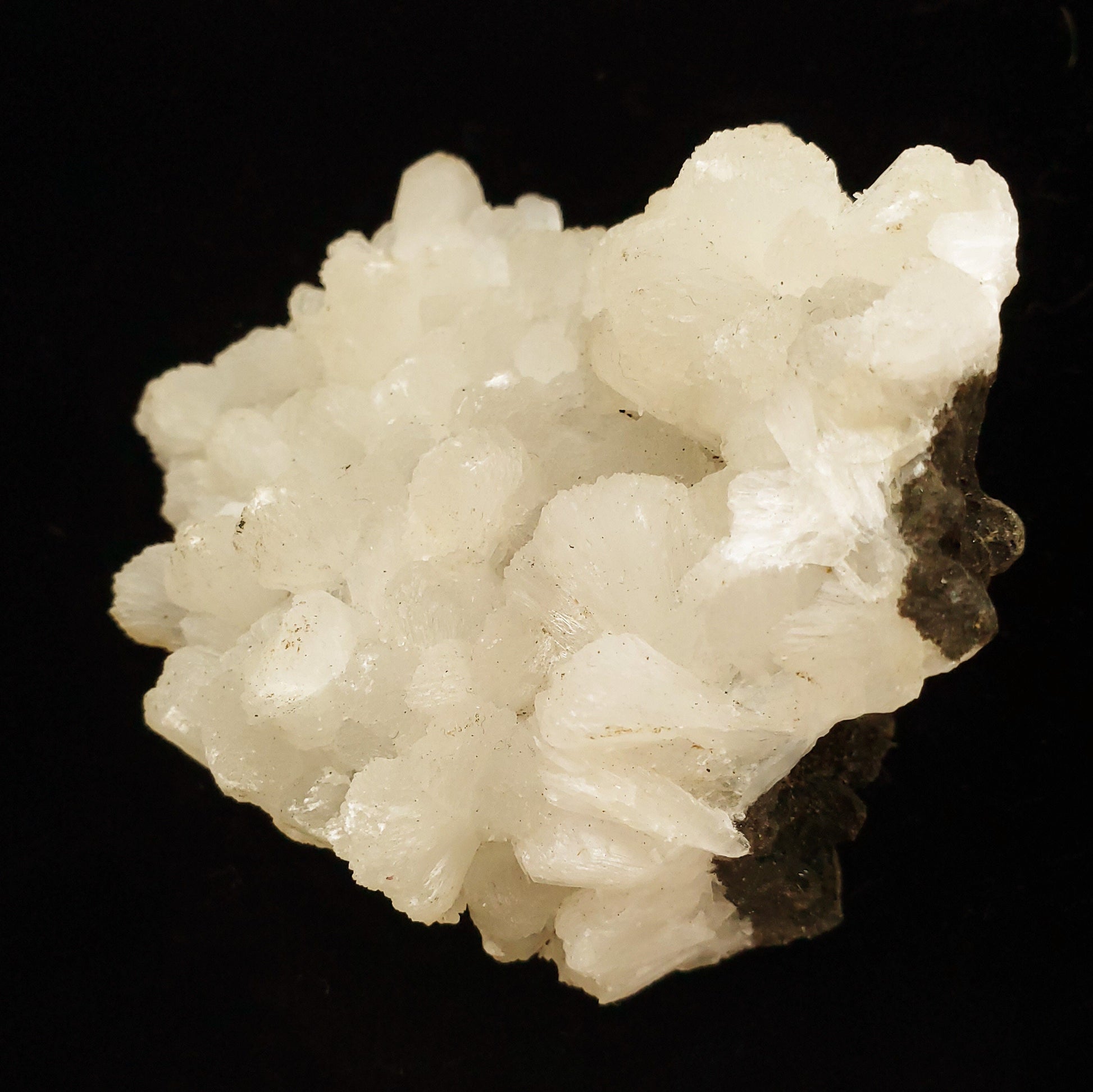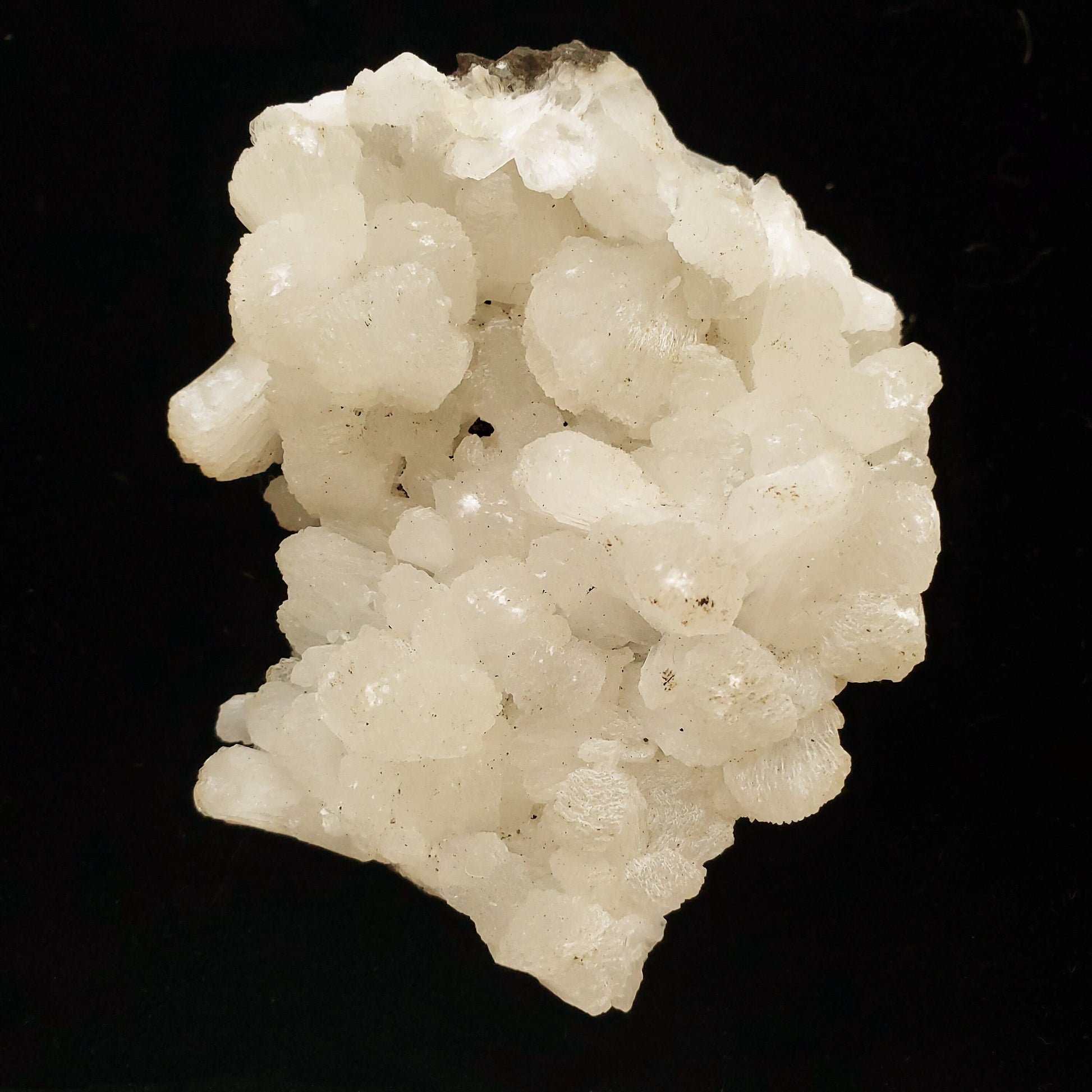 Offered here is a small cabinet size specimen of lustrous, white stilbite crystals on a bit of matrix from the classic Deccan trap locality in India.