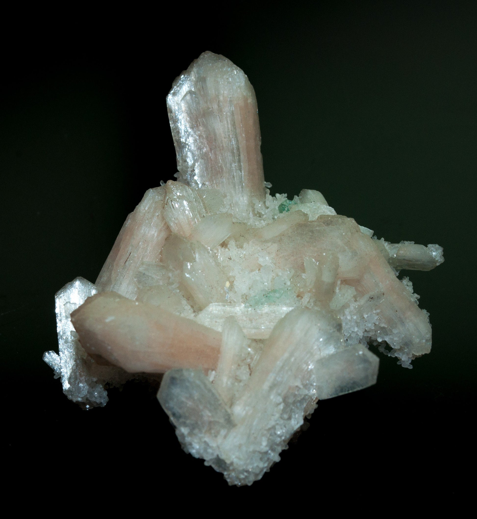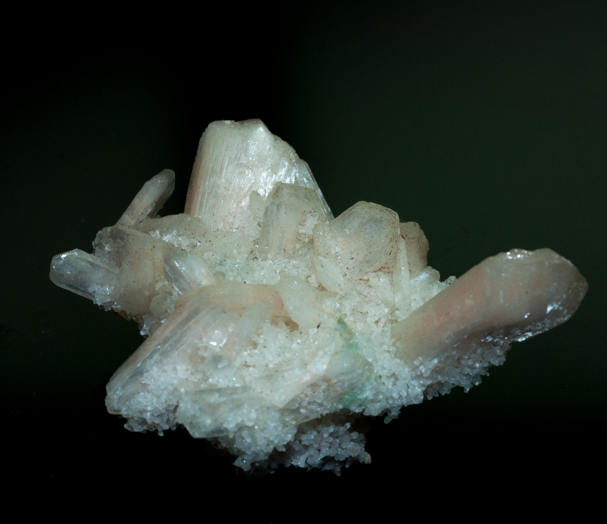 Offered here is a beautiful cluster of pearlescent, pastel-pink, stilbite blades on snowy white drusy quartz crystals. There are a couple of lustrous, green apophyllite crystals measuriing to 1.1 cm as well!