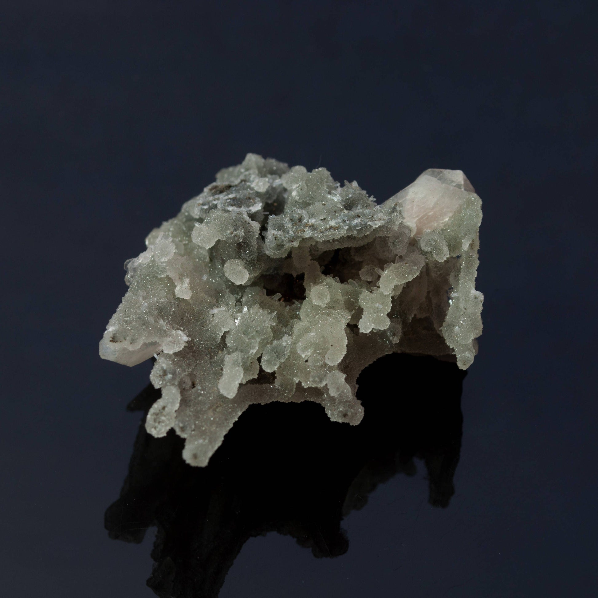 Soft, peachy pink, thin tabular stilbite crystals to 1.8cm on beautiful druze chalcedony. Very pretty, miniature piece!