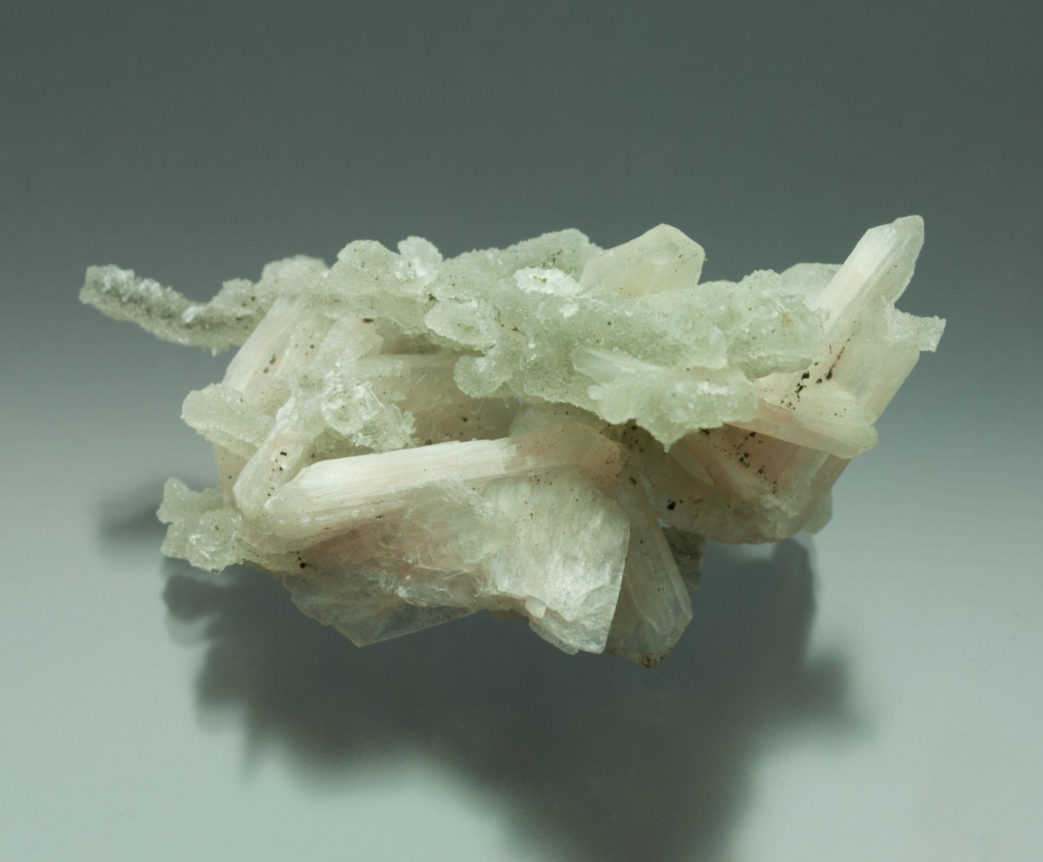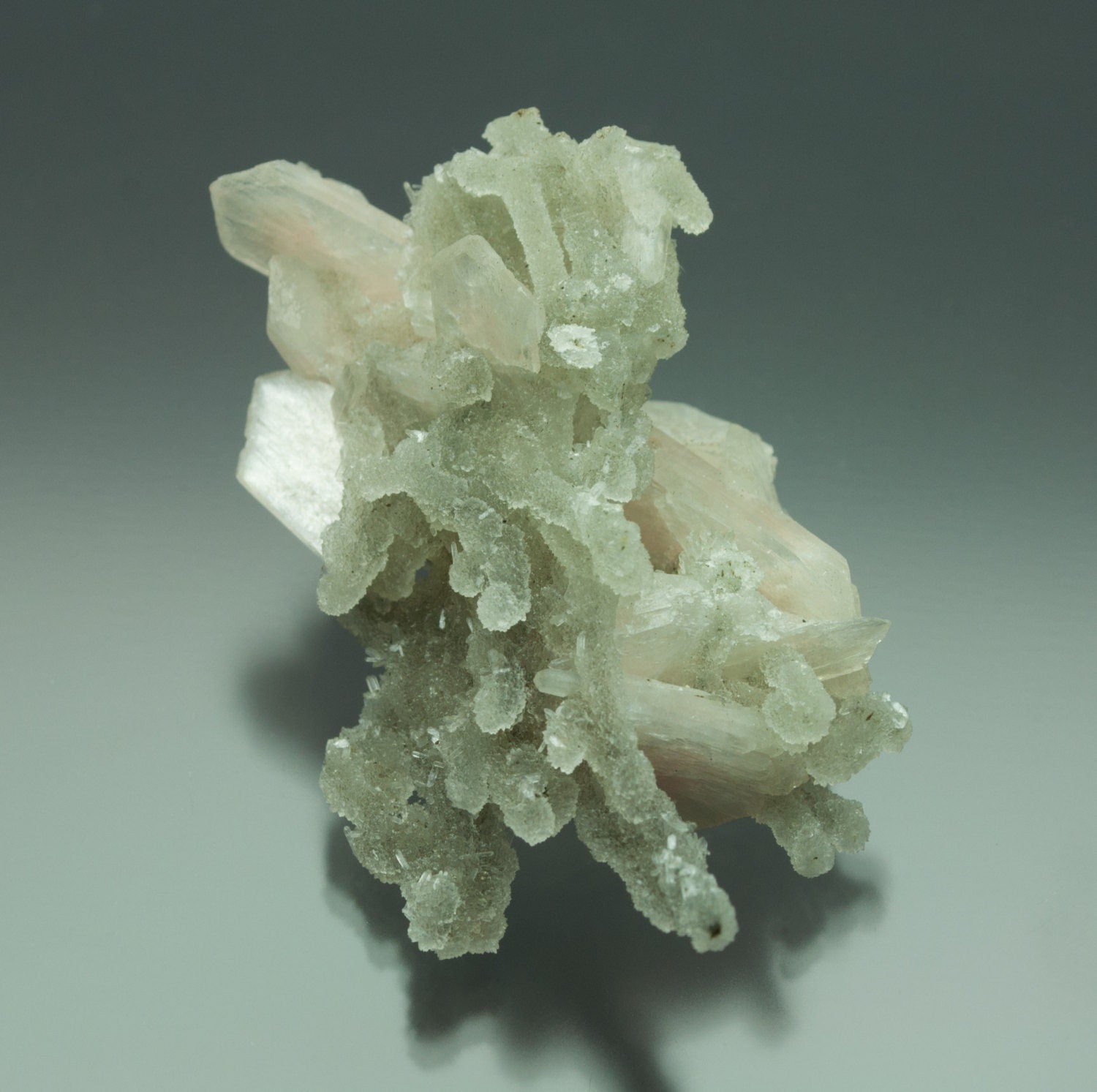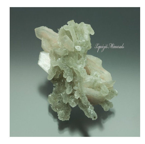 Soft, peachy pink, thin tabular stilbite crystals to 2.5cm on beautiful druze chalcedony. Very pretty, miniature piece!